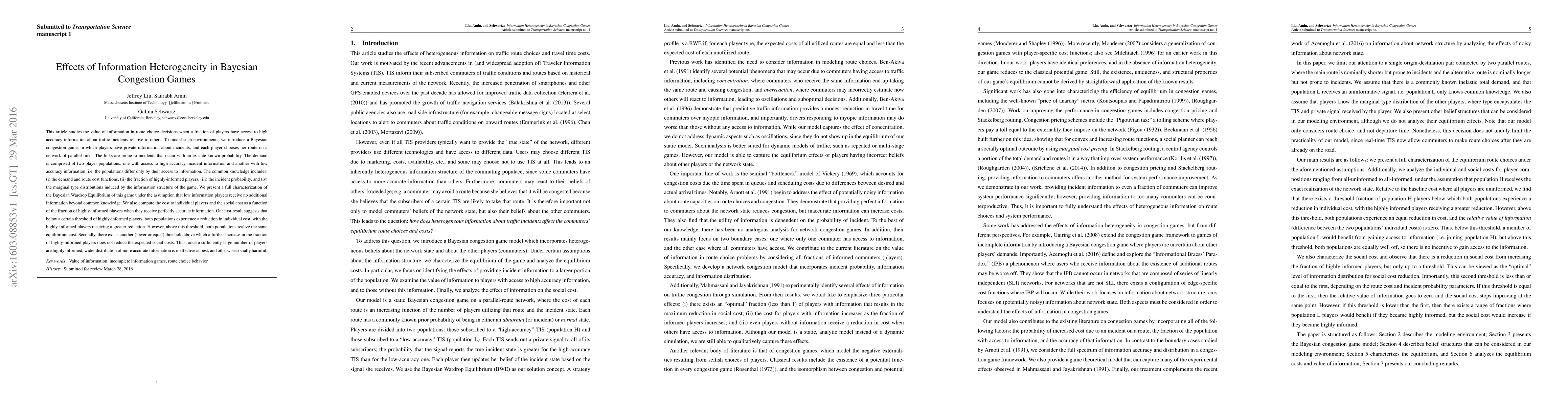 A study on route choice decisions in traffic environments shows that a certain threshold of highly-informed players can reduce individual costs, but beyond this point, further increasing the number of informed players does not improve social outcomes.