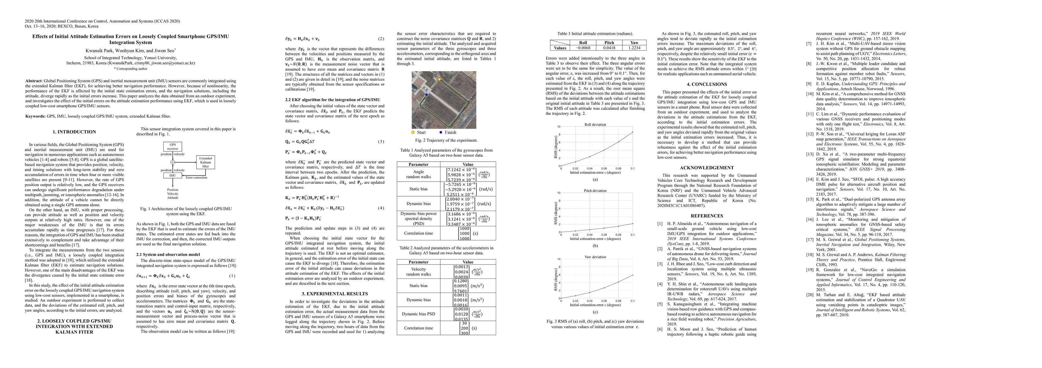 This paper examines the impact of initial attitude estimation errors on the performance of an extended Kalman filter (EKF) used in a low-cost smartphone GPS/IMU integration system. The study reveals that increasing initial errors lead to rapid divergence in navigation solutions, particularly in attitude estimation.