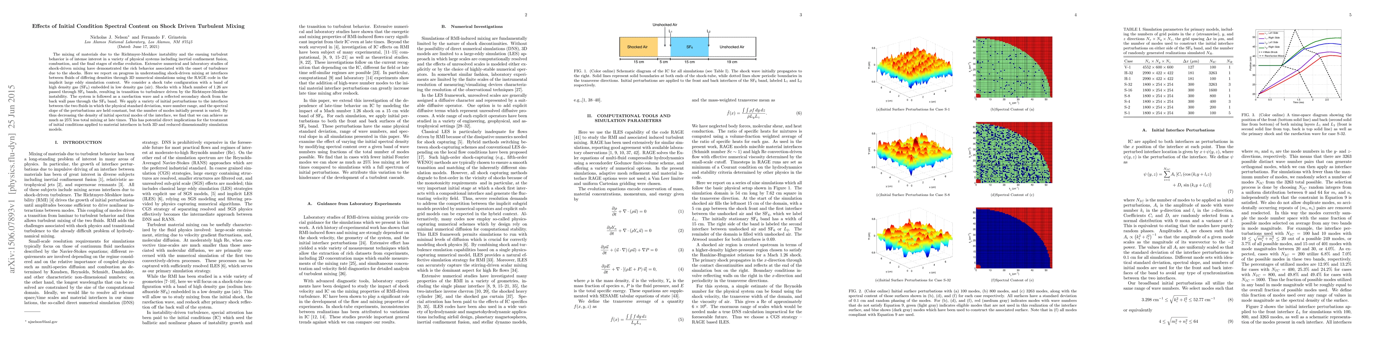 The mixing of materials due to the Richtmyer-Meshkov instability and the ensuing turbulent behavior is of intense interest in a variety of physical systems including inertial confinement fusion, combustion, and the final stages of stellar evolution. Extensive numerical and laboratory studies of shock-driven mixing have demonstrated the rich behavior associated with the onset of turbulence due to the shocks. Here we report on progress in understanding shock-driven mixing at interfaces between fluids of differing densities through 3D numerical simulations using the RAGE code in the implicit large eddy simulation context. We consider a shock tube configuration with a band of high density gas (SF$_6$) embedded in low density gas (air). Shocks with a Mach number of 1.26 are passed through SF$_6$ bands, resulting in transition to turbulence driven by the Richtmyer-Meshkov instability. The system is followed as a rarefaction wave and a reflected secondary shock from the back wall pass through the SF$_6$ band. We apply a variety of initial perturbations to the interfaces between the two fluids in which the physical standard deviation, wave number range, and the spectral slope of the perturbations are held constant, but the number of modes initially present is varied. By thus decreasing the density of initial spectral modes of the interface, we find that we can achieve as much as 25\% less total mixing at late times. This has potential direct implications for the treatment of initial conditions applied to material interfaces in both 3D and reduced dimensionality simulation models.