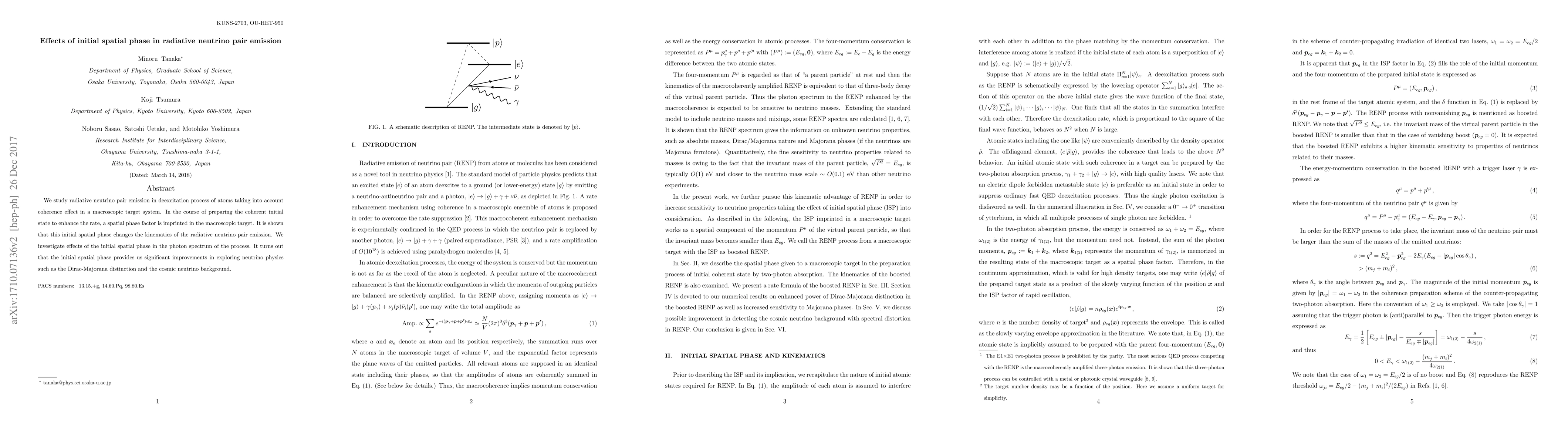 We study radiative neutrino pair emission in deexcitation process of atoms taking into account coherence effect in a macroscopic target system. In the course of preparing the coherent initial state to enhance the rate, a spatial phase factor is imprinted in the macroscopic target. It is shown that this initial spatial phase changes the kinematics of the radiative neutrino pair emission. We investigate effects of the initial spatial phase in the photon spectrum of the process. It turns out that the initial spatial phase provides us significant improvements in exploring neutrino physics such as the Dirac-Majorana distinction and the cosmic neutrino background.