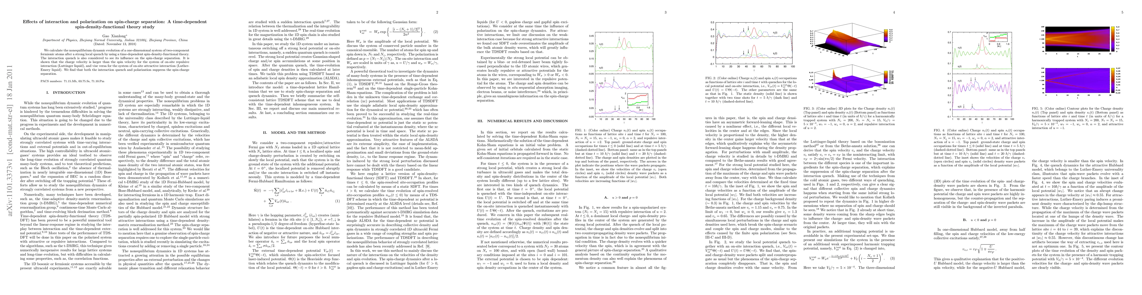 This study uses time-dependent spin-density-functional theory to analyze the dynamic evolution of a one-dimensional fermionic system post-quench, revealing that charge velocity exceeds spin velocity in repulsive systems while the opposite occurs in attractive systems. Interaction quench and polarization are found to suppress spin-charge separation.