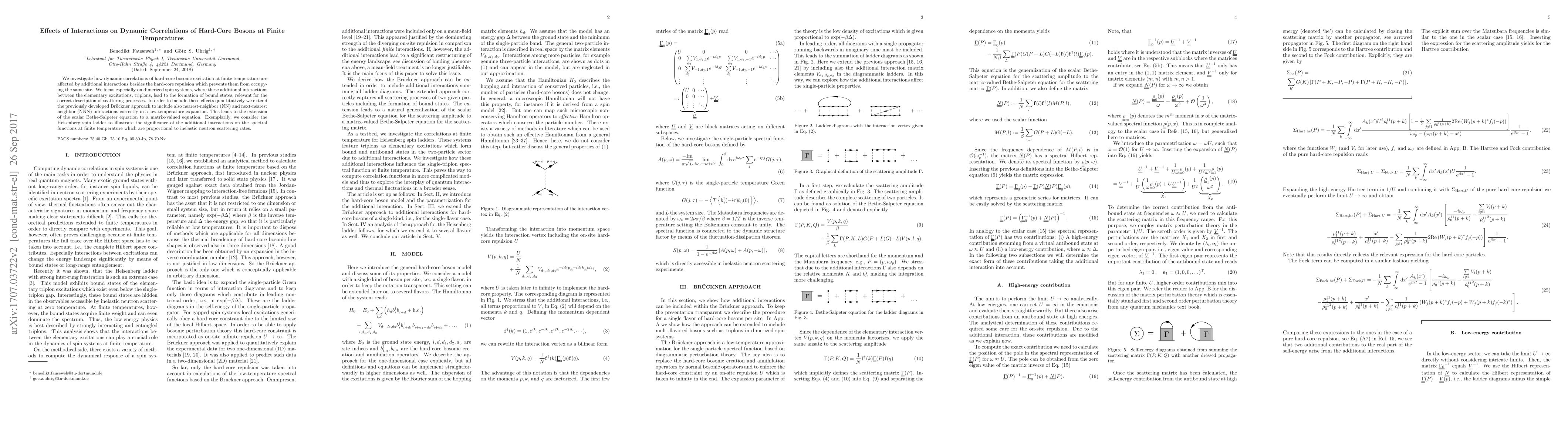 Researchers investigated how additional interactions between hard-core bosonic excitation affect their dynamic correlations at finite temperatures. They developed a new approach to include these effects in the Br"uckner method, leading to a better understanding of scattering processes and inelastic neutron scattering rates.