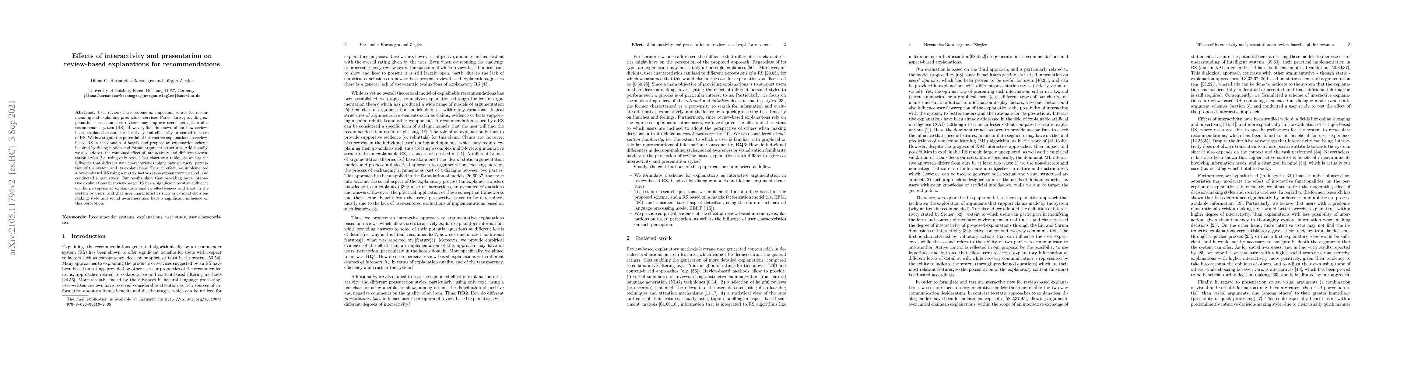 User reviews have become an important source for recommending and explaining products or services. Particularly, providing explanations based on user reviews may improve users' perception of a recommender system (RS). However, little is known about how review-based explanations can be effectively and efficiently presented to users of RS. We investigate the potential of interactive explanations in review-based RS in the domain of hotels, and propose an explanation scheme inspired by dialog models and formal argument structures. Additionally, we also address the combined effect of interactivity and different presentation styles (i.e. using only text, a bar chart or a table), as well as the influence that different user characteristics might have on users' perception of the system and its explanations. To such effect, we implemented a review-based RS using a matrix factorization explanatory method, and conducted a user study. Our results show that providing more interactive explanations in review-based RS has a significant positive influence on the perception of explanation quality, effectiveness and trust in the system by users, and that user characteristics such as rational decision-making style and social awareness also have a significant influence on this perception.