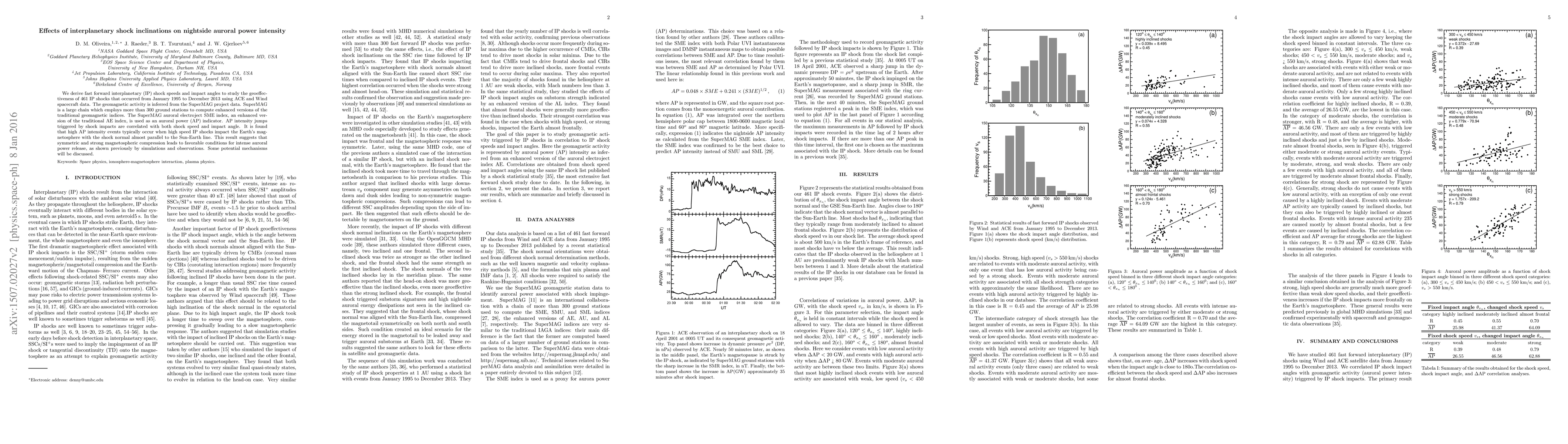 This study analyzes 461 interplanetary shocks from 1995-2013 using ACE and WIND data, finding that high auroral power intensity events occur when fast shocks hit Earth with normals near parallel to the Sun-Earth line, indicating symmetric compression enhances auroral activity.