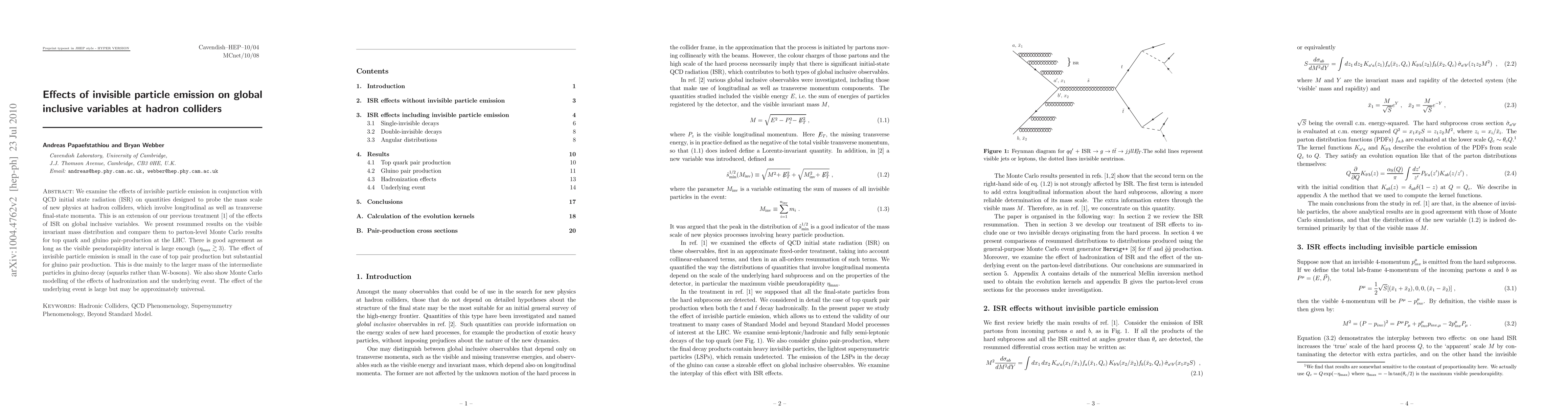 We examine the effects of invisible particle emission in conjunction with QCD initial state radiation (ISR) on quantities designed to probe the mass scale of new physics at hadron colliders, which involve longitudinal as well as transverse final-state momenta. This is an extension of our previous treatment, arXiv:0903.2013, of the effects of ISR on global inclusive variables. We present resummed results on the visible invariant mass distribution and compare them to parton-level Monte Carlo results for top quark and gluino pair-production at the LHC. There is good agreement as long as the visible pseudorapidity interval is large enough (eta ~ 3). The effect of invisible particle emission is small in the case of top pair production but substantial for gluino pair production. This is due mainly to the larger mass of the intermediate particles in gluino decay (squarks rather than W-bosons). We also show Monte Carlo modelling of the effects of hadronization and the underlying event. The effect of the underlying event is large but may be approximately universal.