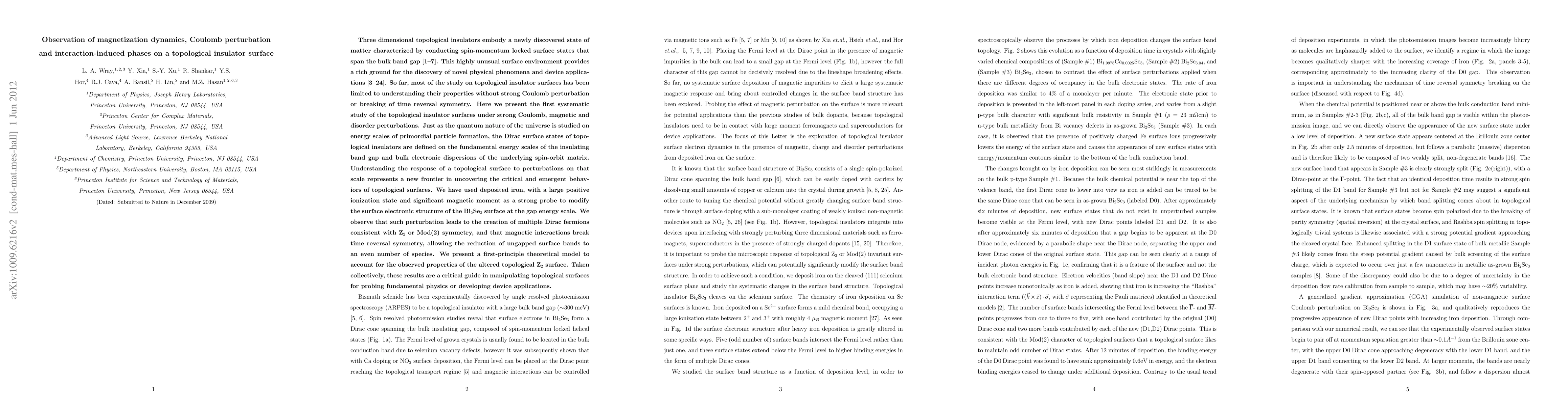 Topological insulators embody a newly discovered state of matter characterized by conducting spin-momentum locked surface states that span the bulk band gap. So far, most of the study on topological insulator surfaces has been limited to understanding their properties without strong Coulomb perturbation or breaking of time reversal symmetry. We have used deposited iron, with a large positive ionization state and significant magnetic moment as a strong probe to modify the surface electronic structure of the Bi2Se3 surface at the gap energy scale. We observe that such perturbation leads to the creation of multiple Dirac fermions consistent with Z2 or Mod(2) symmetry. Taken collectively, these results are a helpful guide in manipulating topological surfaces for probing fundamental physics or developing device applications.