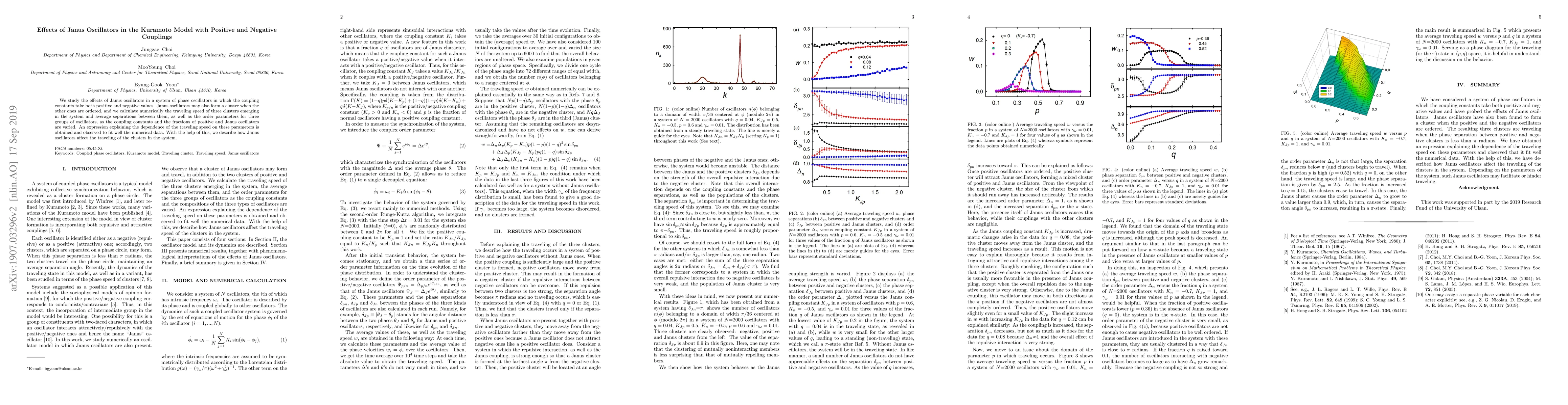 We study the effects of Janus oscillators in a system of phase oscillators in which the coupling constants take both positive and negative values. Janus oscillators may also form a cluster when the other ones are ordered and we calculate numerically the traveling speed of three clusters emerging in the system and average separations between them as well as the order parameters for three groups of oscillators, as the coupling constants and the fractions of positive and Janus oscillators are varied. An expression explaining the dependence of the traveling speed on these parameters is obtained and observed to fit well the numerical data. With the help of this, we describe how Janus oscillators affect the traveling of the clusters in the system.