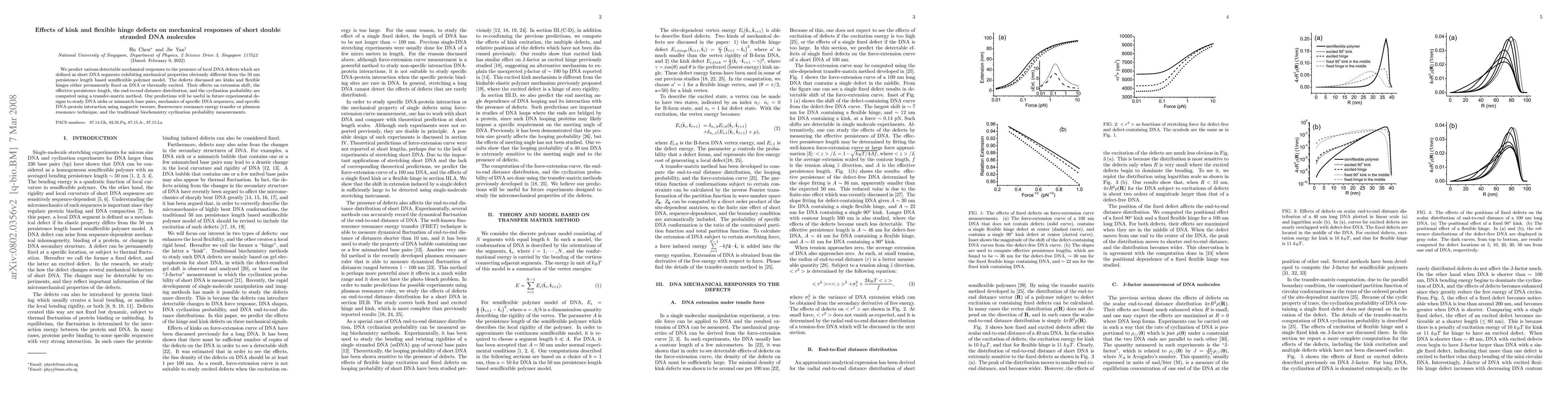 We predict various detectable mechanical responses to the presence of local DNA defects which are defined as short DNA segments exhibiting mechanical properties obviously different from the 50 nm persistence length based semiflexible polymer model. The defects discussed are kinks and flexible hinges either permanently fixed on DNA or thermally excited. Their effects on extension shift, the effective persistence length, the end-to-end distance distribution, and the cyclization probability are computed using a transfer-matrix method. Our predictions will be useful in future experimental designs to study DNA nicks or mismatch base pairs, mechanics of specific DNA sequences, and specific DNA-protein interaction using magnetic tweezer, fluorescence resonance energy transfer or plasmon resonance technique, and the traditional biochemistry cyclization probability measurements.