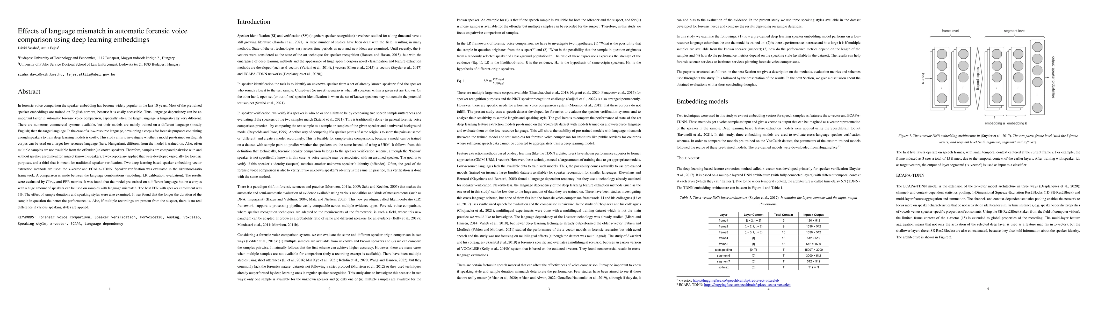 This study investigates the effectiveness of deep learning embeddings pre-trained on English corpora for automatic forensic voice comparison in low-resource languages like Hungarian. Results show that despite language mismatch, pre-trained models perform well, especially with longer sample durations, while speaking styles have minimal impact.