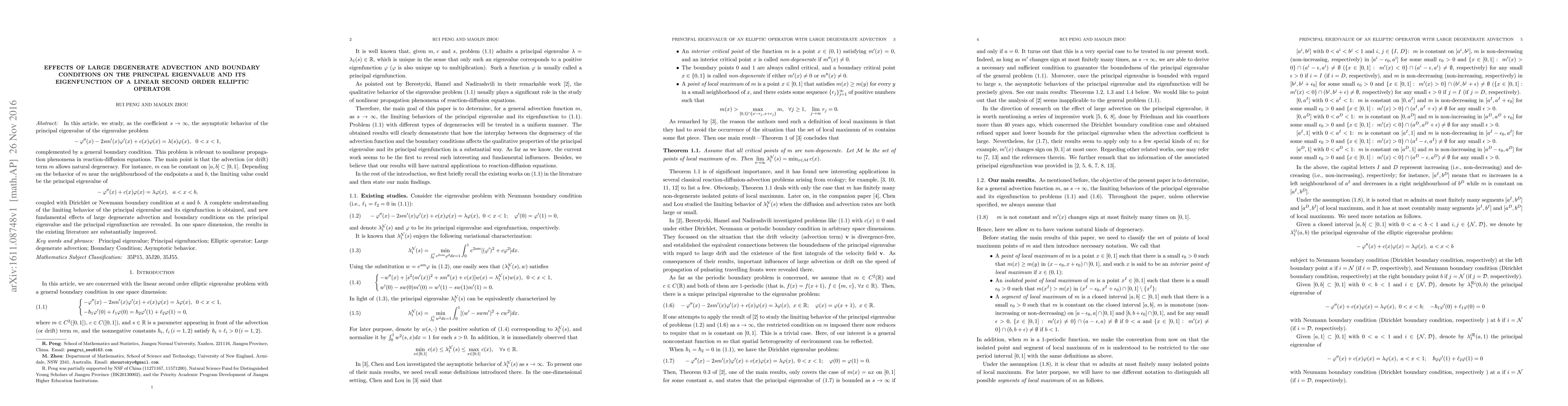 This paper investigates the asymptotic behavior of the principal eigenvalue of a linear second-order elliptic operator under large degenerate advection and various boundary conditions. It reveals the limiting value of the principal eigenvalue and eigenfunction, improving existing results in one-dimensional settings.