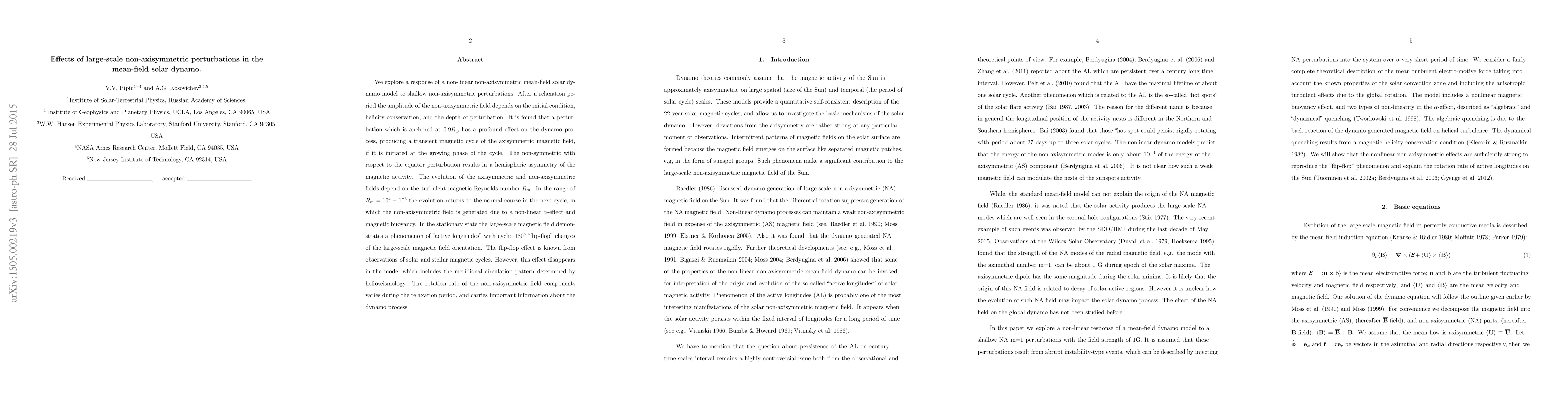 We explore a response of a non-linear non-axisymmetric mean-field solar dynamo model to shallow non-axisymmetric perturbations. After a relaxation period the amplitude of the non-axisymmetric field depends on the initial condition, helicity conservation, and the depth of perturbation. It is found that a perturbation which is anchored at r=0.9R has a profound effect on the dynamo process, producing a transient magnetic cycle of the axisymmetric magnetic field, if it is initiated at the growing phase of the cycle. The non-symmetric with respect to the equator perturbation results in a hemispheric asymmetry of the magnetic activity. The evolution of the axisymmetric and non-axisymmetric field depends on the turbulent magnetic Reynolds number R_m. In the range of R_m=10^{4-6} the evolution returns to the normal course in the next cycle, in which the non-axisymmetric field is generated due to a non-linear alpha-effect and magnetic buoyancy. In the stationary state the large-scale magnetic field demonstrates a phenomenon of "active longitudes" with cyclic 180 degree "flip-flop" changes of the large-scale magnetic field orientation. The flip-flop effect is known from observations of solar and stellar magnetic cycles. However this effect disappears in the model which includes the meridional circulation pattern determined by helioseismology. The rotation rate of the non-axisymmetric field components varies during the relaxation period, and carries important information about the dynamo process.