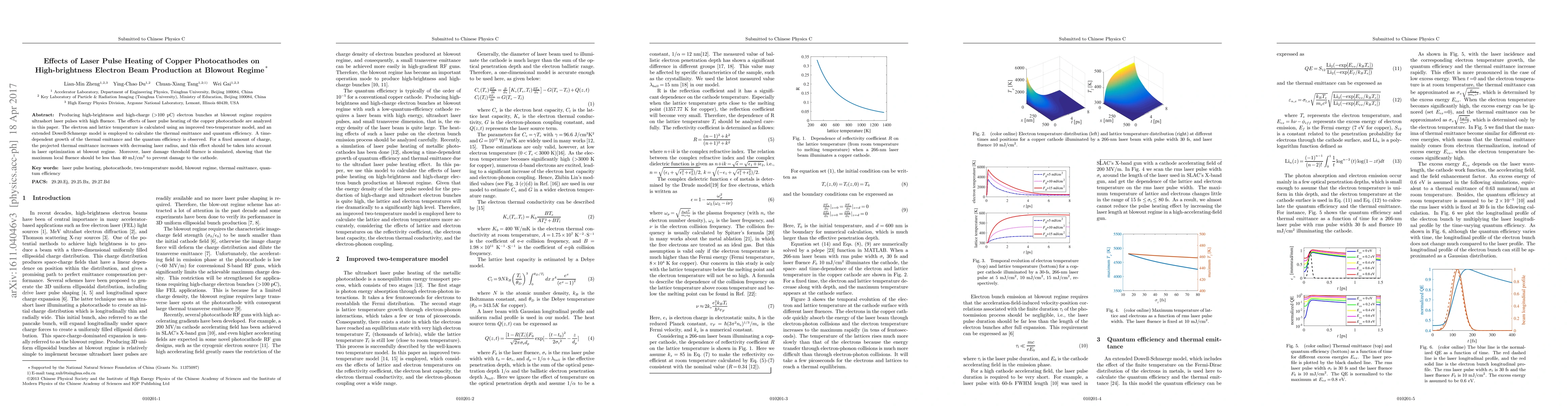 This paper investigates the impact of laser pulse heating on copper photocathodes for high-brightness electron beam production at the blowout regime. It employs a two-temperature model to calculate electron and lattice temperatures, revealing a time-dependent growth in thermal emittance and quantum efficiency, and suggests laser fluence should be below 40 mJ/cm^2 to avoid cathode damage.