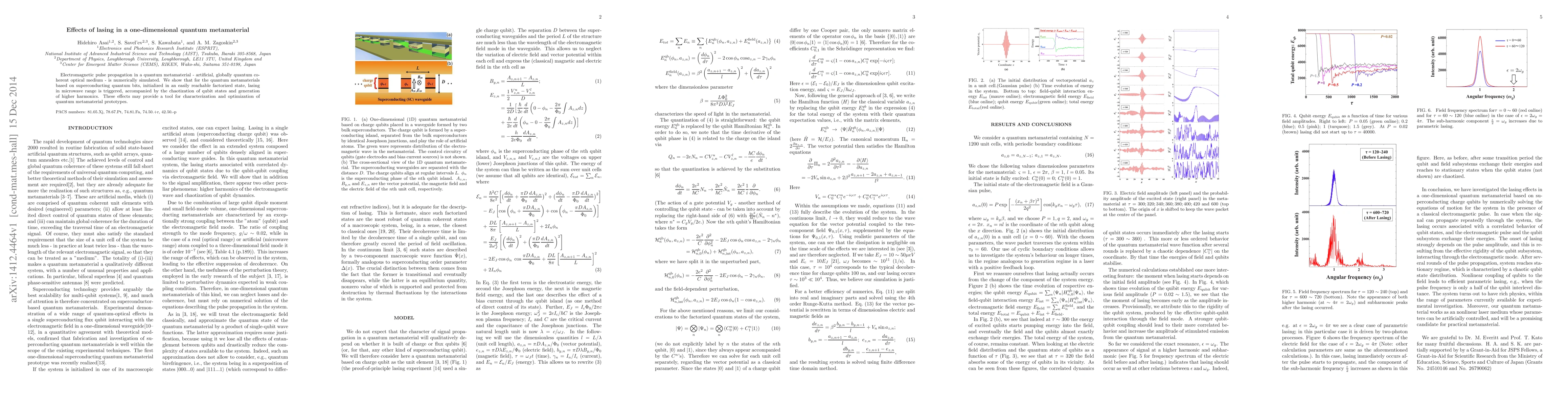 Electromagnetic pulse propagation in a quantum metamaterial - artificial, globally quantum coherent optical medium - is numerically simulated. We show that for the quantum metamaterials based on superconducting quantum bits, initialized in an easily reachable factorized state, lasing in microwave range is triggered, accompanied by the chaotization of qubit states and generation of higher harmonics. These effects may provide a tool for characterization and optimization of quantum metamaterial prototypes.