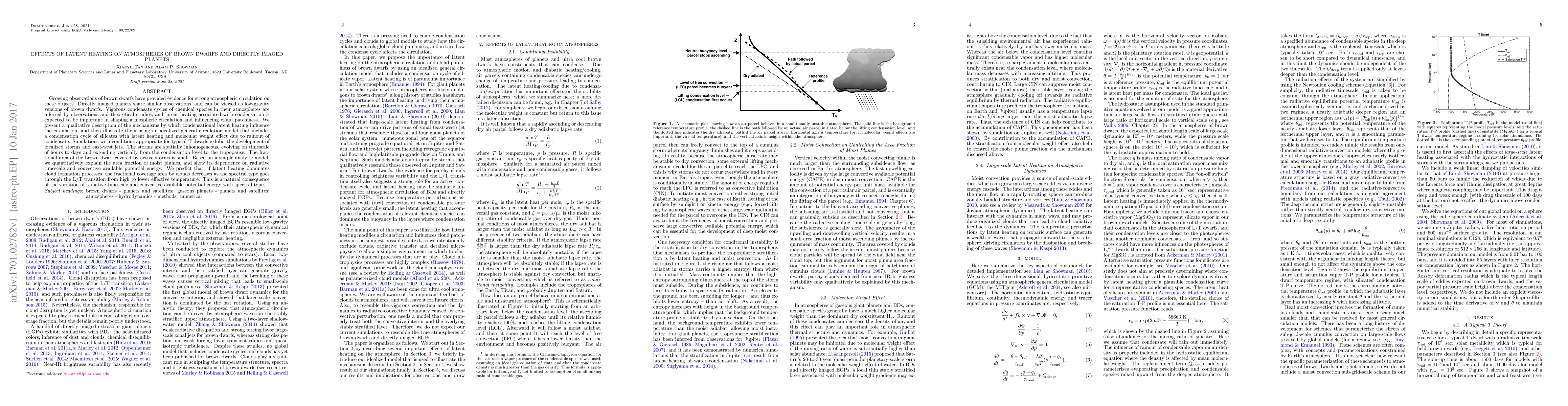 This paper investigates how latent heating from condensation cycles affects atmospheric circulation in brown dwarfs and directly imaged planets. Using an idealized general circulation model, it demonstrates the formation of localized storms and east-west jets, showing that latent heating influences cloud patchiness and circulation patterns.