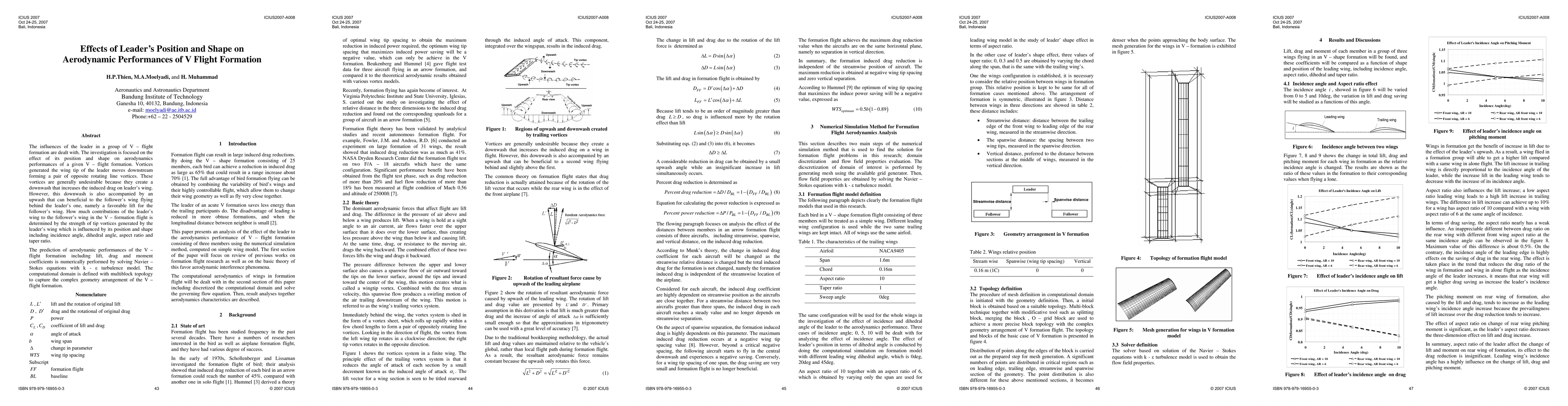 This study investigates how the leader's position and shape in a V flight formation influence aerodynamic performance, focusing on the generation of tip vortices and their impact on induced drag and lift. Numerical simulations using the Navier-Stokes equations predict the lift, drag, and moment coefficients for the formation.