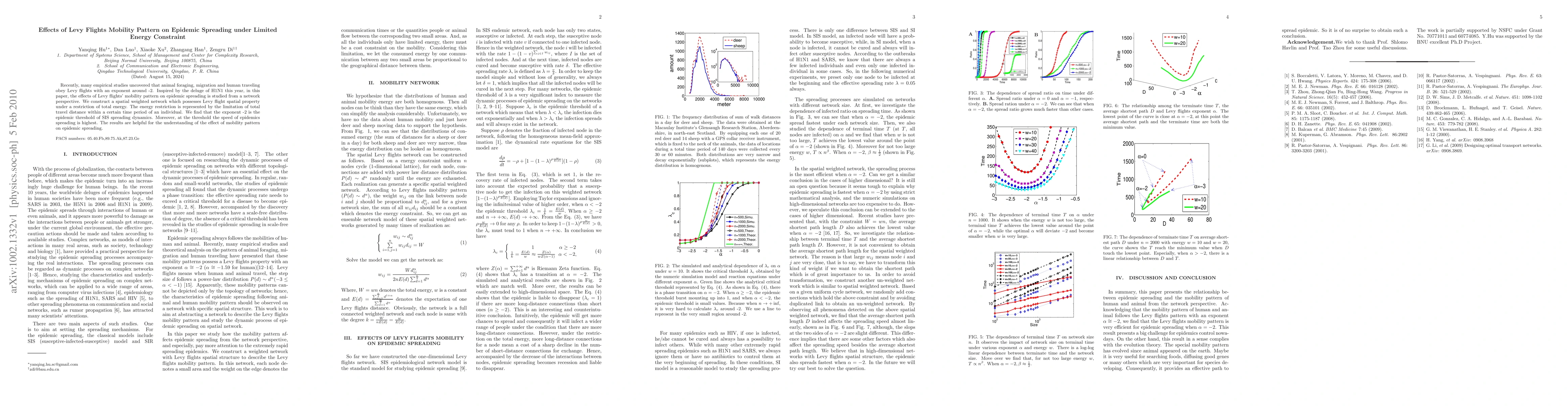 This paper investigates how the Levy flights mobility pattern influences epidemic spreading in a network constrained by limited energy. It constructs a spatial weighted network reflecting Levy flight properties under travel distance limits, finding that the exponent -2 acts as an epidemic threshold, with the highest spreading speed at this threshold.