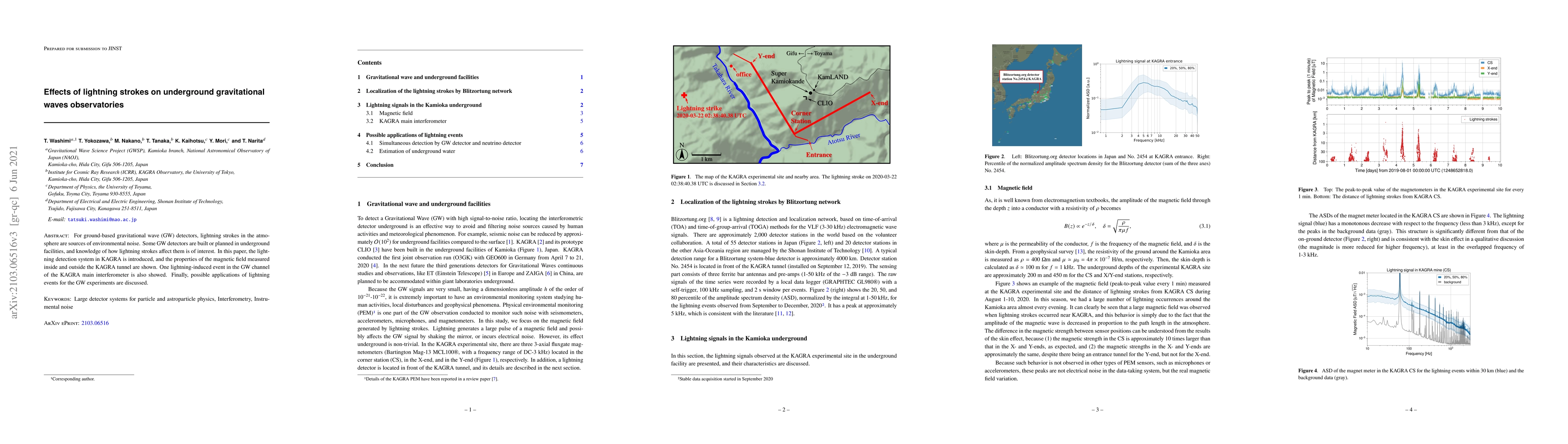 This paper investigates the impact of lightning strokes on underground gravitational wave observatories, using KAGRA as a case study. It details the lightning detection system and analyzes magnetic field measurements, revealing a lightning-induced event in the KAGRA interferometer, and discusses potential applications of such events for gravitational wave experiments.