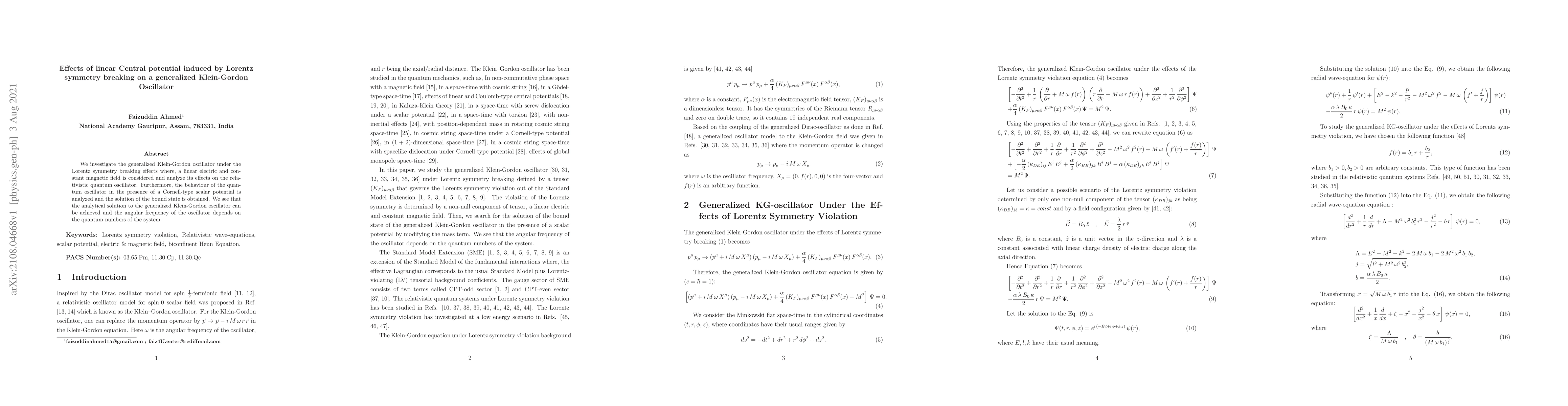 This paper explores the generalized Klein-Gordon oscillator under Lorentz symmetry breaking, considering linear electric and constant magnetic fields. It analyzes the oscillator's behavior with a Cornell-type scalar potential, achieving an analytical solution where the angular frequency depends on the system's quantum numbers.