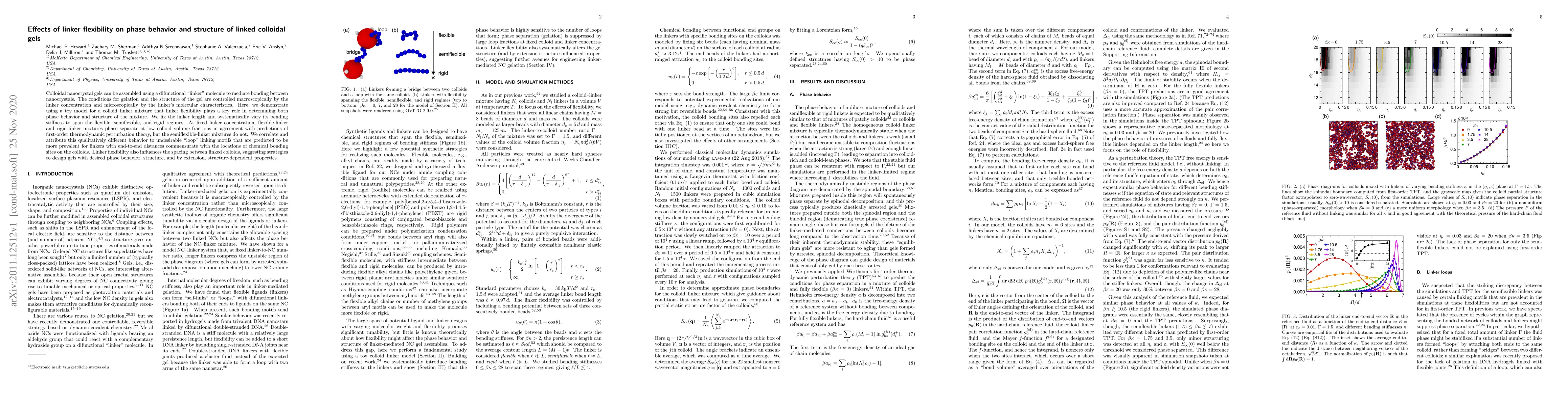 Colloidal nanocrystal gels can be assembled using a difunctional "linker" molecule to mediate bonding between nanocrystals. The conditions for gelation and the structure of the gel are controlled macroscopically by the linker concentration and microscopically by the linker's molecular characteristics. Here, we demonstrate using a toy model for a colloid-linker mixture that linker flexibility plays a key role in determining both phase behavior and structure of the mixture. We fix the linker length and systematically vary its bending stiffness to span the flexible, semiflexible, and rigid regimes. At fixed linker concentration, flexible-linker and rigid-linker mixtures phase separate at low colloid volume fractions in agreement with predictions of first-order thermodynamic perturbation theory, but the semiflexible-linker mixtures do not. We correlate and attribute this qualitatively different behavior to undesirable "loop" linking motifs that are predicted to be more prevalent for linkers with end-to-end distances commensurate with the locations of chemical bonding sites on the colloids. Linker flexibility also influences the spacing between linked colloids, suggesting strategies to design gels with desired phase behavior, structure, and by extension, structure-dependent properties.