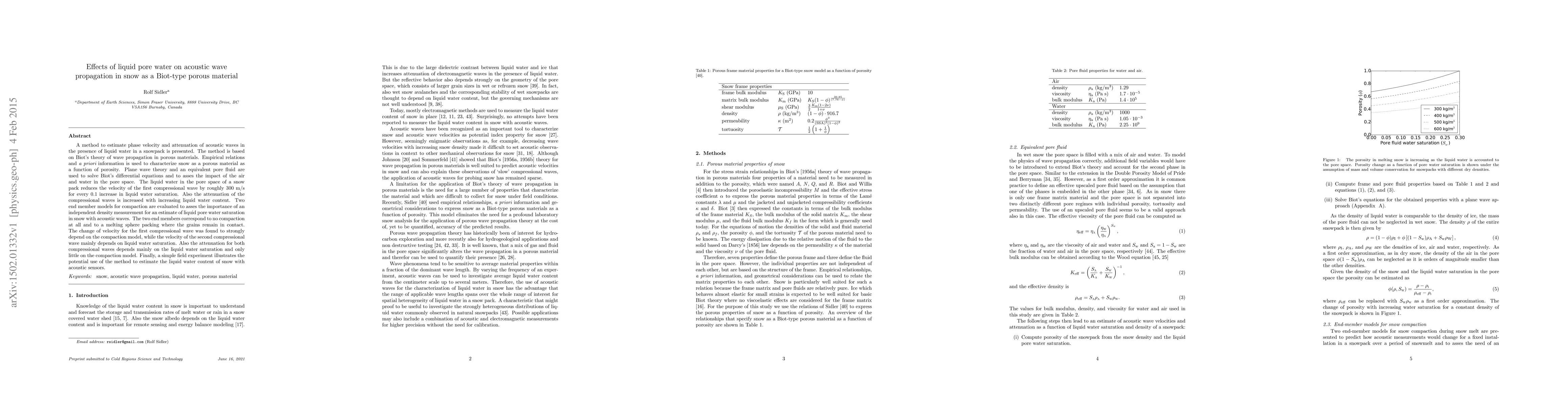 A method to estimate phase velocity and attenuation of acoustic waves in the presence of liquid water in a snowpack is presented. The method is based on Biot's theory of wave propagation in porous materials. Empirical relations and a priori information is used to characterize snow as a porous material as a function of porosity. Plane wave theory and an equivalent pore fluid are used to solve Biot's differential equations and to asses the impact of the air and water in the pore space. The liquid water in the pore space of a snow pack reduces the velocity of the first compressional wave by roughly 300 m/s for every 0.1 increase in liquid water saturation. Also the attenuation of the compressional waves is increased with increasing liquid water content. Two end member models for compaction are evaluated to asses the importance of an independent density measurement for an estimate of liquid pore water saturation in snow with acoustic waves. The two end members correspond to no compaction at all and to a melting sphere packing where the grains remain in contact. The change of velocity for the first compressional wave was found to strongly depend on the compaction model, while the velocity of the second compressional wave mainly depends on liquid water saturation. Also the attenuation for both compressional waves depends mainly on the liquid water saturation and only little on the compaction model. Finally, a simple field experiment illustrates the potential use of the method to estimate the liquid water content of snow with acoustic sensors.