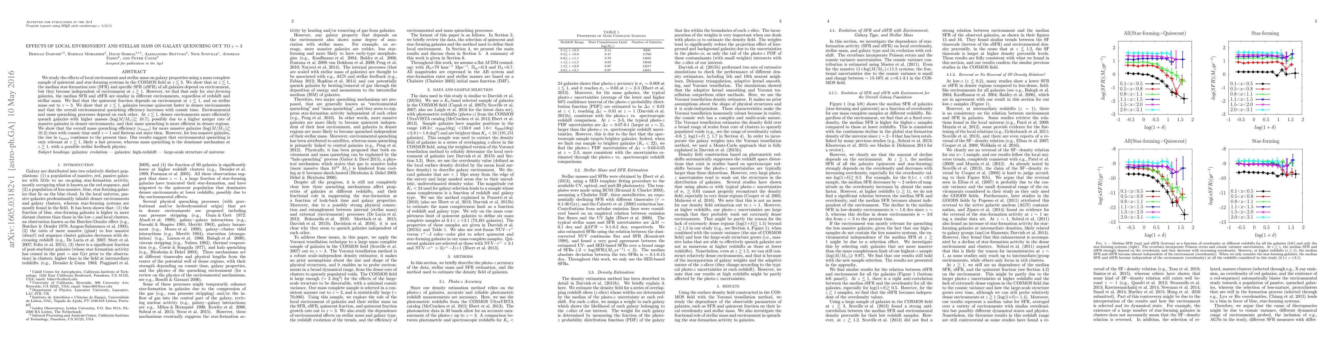 We study the effects of local environment and stellar mass on galaxy properties using a mass complete sample of quiescent and star-forming systems in the COSMOS field at $z\lesssim$ 3. We show that at $z\lesssim$ 1, the median star-formation rate (SFR) and specific SFR (sSFR) of all galaxies depend on environment, but they become independent of environment at $z\gtrsim$ 1. However, we find that only for \textit{star-forming} galaxies, the median SFR and sSFR are similar in different environments, regardless of redshift and stellar mass. We find that the quiescent fraction depends on environment at $z\lesssim$ 1, and on stellar mass out to $z\sim$ 3. We show that at $z\lesssim$ 1, galaxies become quiescent faster in denser environments and that the overall environmental quenching efficiency increases with cosmic time. Environmental and mass quenching processes depend on each other. At $z\lesssim$ 1, denser environments more efficiently quench galaxies with higher masses (log($M/M_{\odot}$)$\gtrsim$ 10.7), possibly due to a higher merger rate of massive galaxies in denser environments, and that mass quenching is more efficient in denser regions. We show that the overall mass quenching efficiency ($\epsilon_{mass}$) for more massive galaxies (log($M/M_{\odot}$)$\gtrsim$ 10.2) rises with cosmic time until $z\sim$ 1 and flattens out since then. However, for less massive galaxies, the rise in $\epsilon_{mass}$ continues to the present time. Our results suggest that environmental quenching is only relevant at $z\lesssim$ 1, likely a fast process, whereas mass quenching is the dominant mechanism at $z\gtrsim$ 1, with a possible stellar feedback physics.