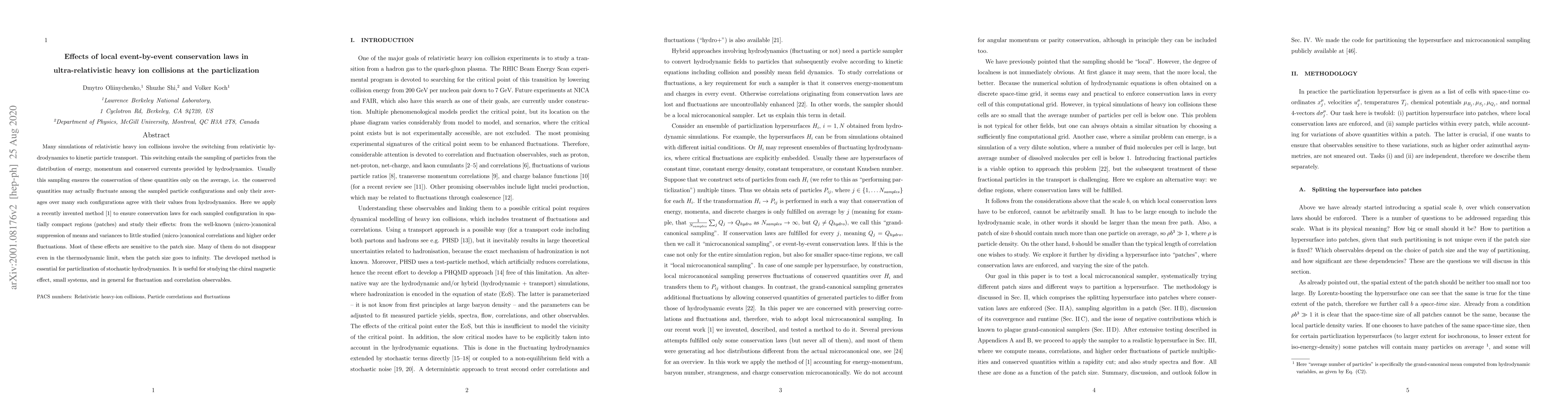 Many simulations of relativistic heavy ion collisions involve the switching from relativistic hydrodynamics to kinetic particle transport. This switching entails the sampling of particles from the distribution of energy, momentum and conserved currents provided by hydrodynamics. Usually this sampling ensures the conservation of these quantities only on the average, i.e. the conserved quantities may actually fluctuate among the sampled particle configurations and only their averages over many such configurations agree with their values from hydrodynamics. Here we apply a recently invented method [Oliinychenko, Koch; PRL 123, 18, 182302 (2019)] to ensure conservation laws for each sampled configuration in spatially compact regions (patches) and study their effects: from the well-known (micro-)canonical suppression of means and variances to little studied (micro-)canonical correlations and higher order fluctuations. Most of these effects are sensitive to the patch size. Many of them do not disappear even in the thermodynamic limit, when the patch size goes to infinity. The developed method is essential for particlization of stochastic hydrodynamics. It is useful for studying the chiral magnetic effect, small systems, and in general for fluctuation and correlation observables.
