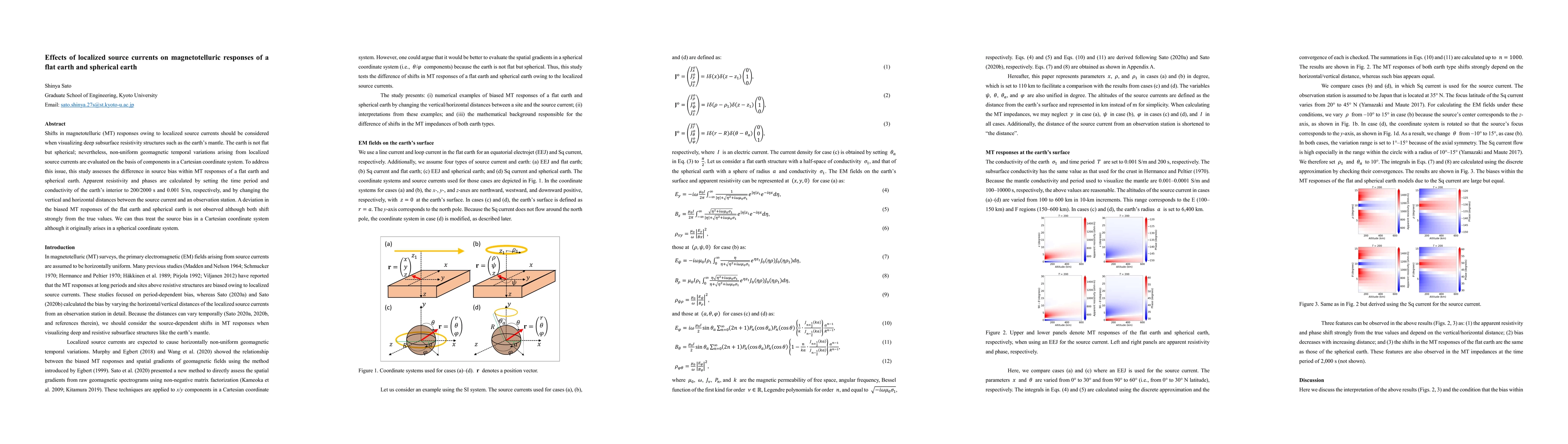 This study examines the effects of localized source currents on magnetotelluric responses for both flat and spherical Earth models, finding no significant difference in source bias despite the Earth's spherical nature. It concludes that Cartesian coordinate-based calculations can adequately address source bias.