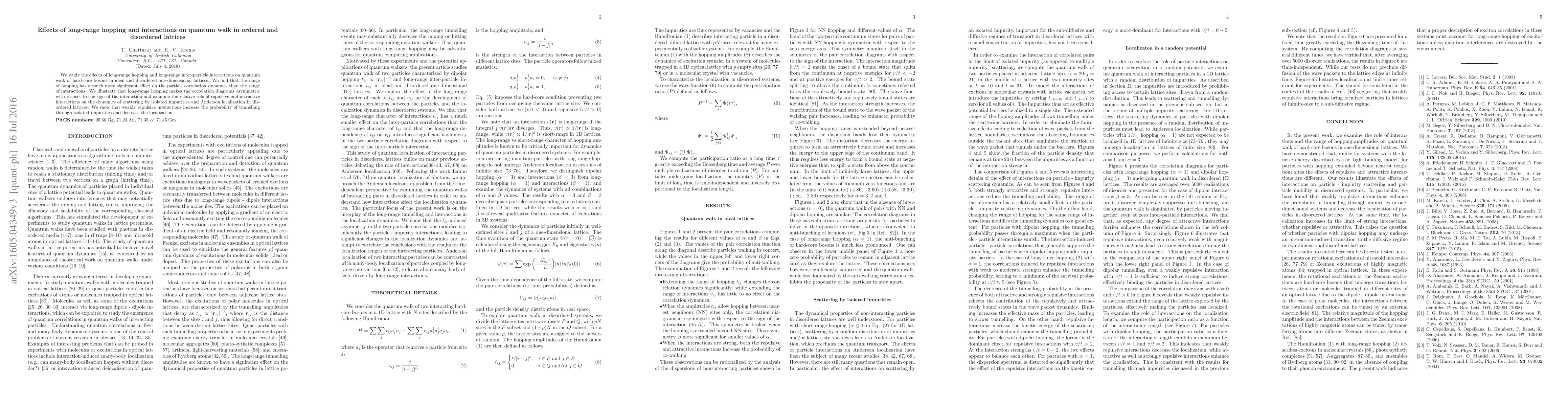 Summary: This paper investigates the impact of long-range hopping and interactions on quantum walk dynamics in one-dimensional lattices, finding that long-range hopping significantly affects particle correlation dynamics more than interactions. It demonstrates that long-range hopping induces asymmetry in correlation diagrams and shows that weakly repulsive interactions enhance tunneling through impurities and reduce localization in disordered systems.