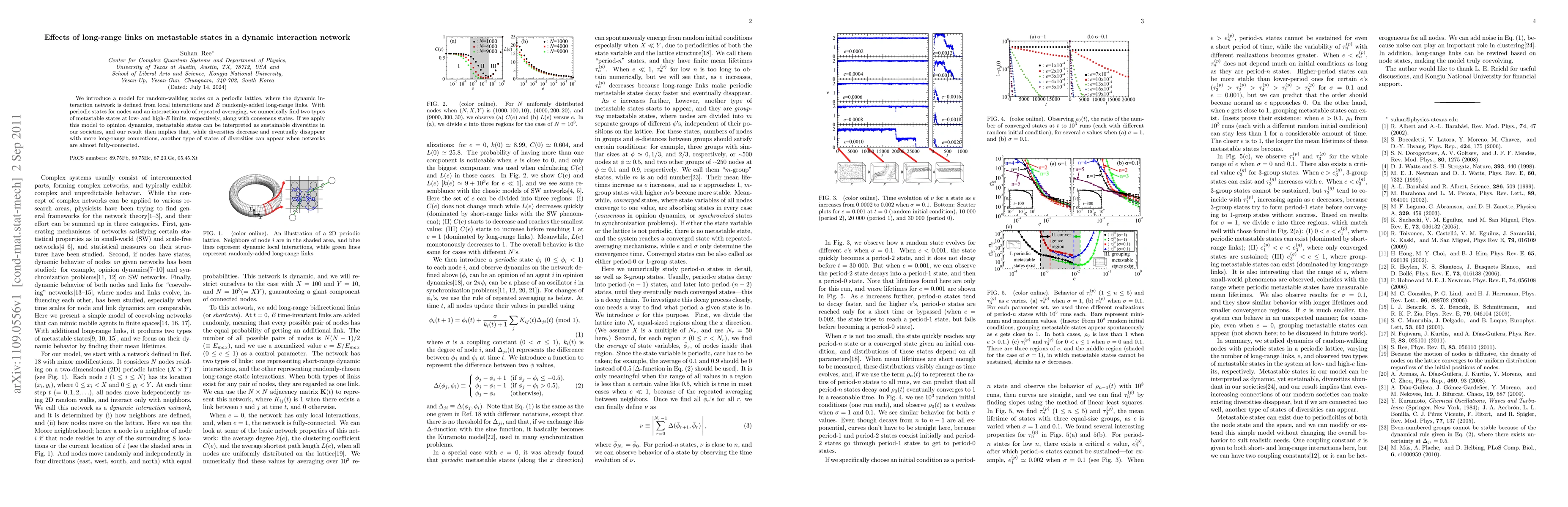 This paper models random-walking nodes on a lattice with dynamic interactions, introducing long-range links to study metastable states. It finds two types of metastable states at low and high levels of long-range links, suggesting that while diversity decreases with increased connectivity, fully-connected networks can sustain another form of diversity.