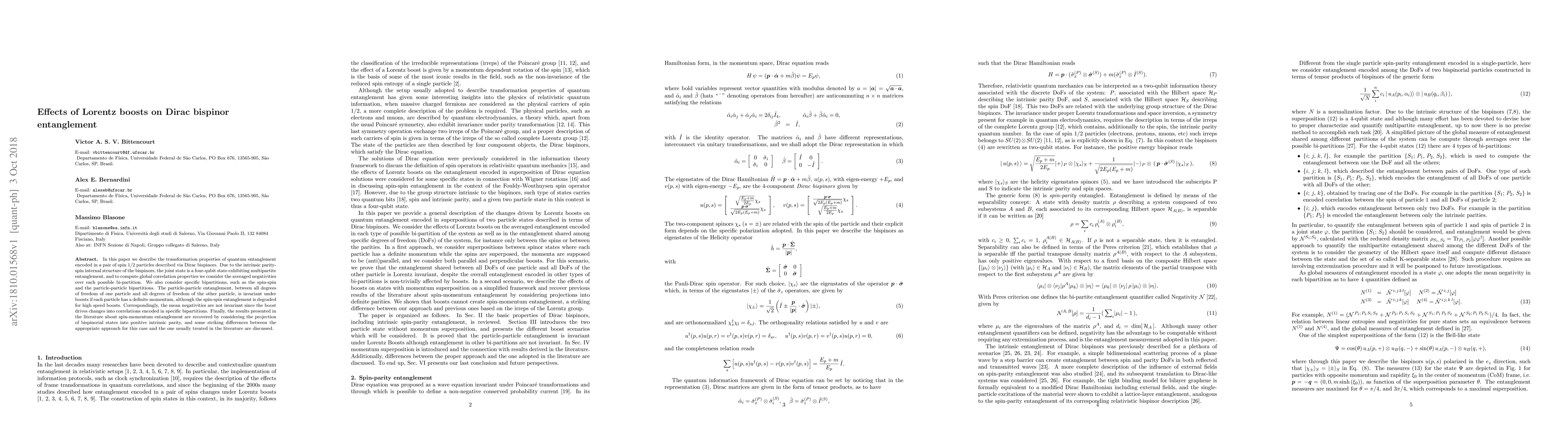 This paper investigates how Lorentz boosts affect the entanglement in a pair of Dirac bispinors representing spin 1/2 particles, revealing that while particle-particle entanglement remains invariant under boosts, spin-spin entanglement degrades at high speeds. The study also highlights differences in treating spin-momentum entanglement compared to standard literature approaches.