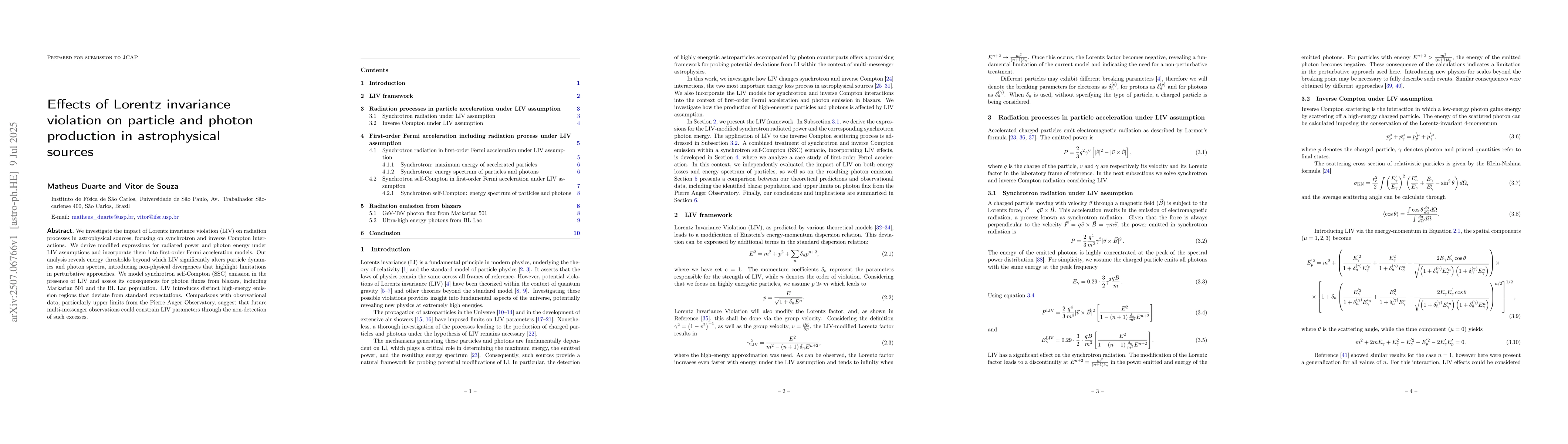 The paper presents modified radiation expressions under LIV assumptions and applies them to first-order Fermi acceleration models, revealing significant deviations in particle dynamics and photon spectra at high energies.