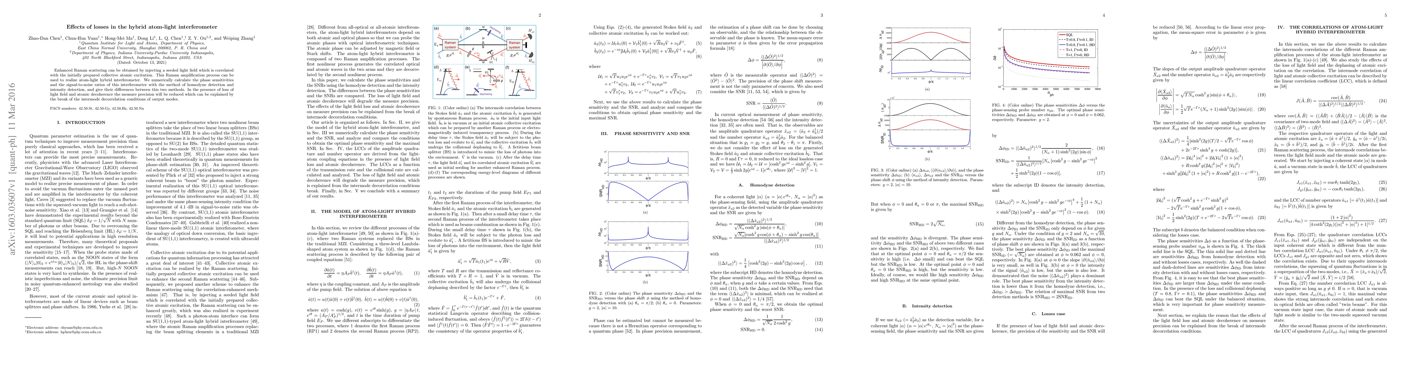 This paper investigates the effects of losses in a hybrid atom-light interferometer, demonstrating how enhanced Raman scattering can improve its performance. It compares phase sensitivities and signal-to-noise ratios using homodyne and intensity detection, showing that both light field loss and atomic decoherence reduce measurement precision by breaking intermode decorrelation.
