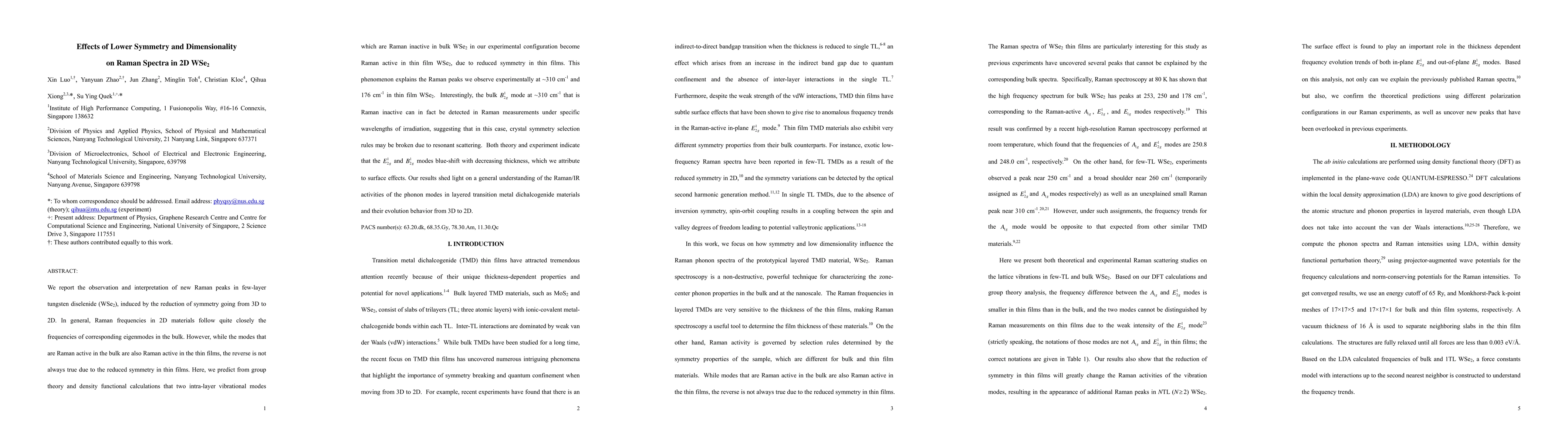 We report the observation and interpretation of new Raman peaks in few-layer tungsten diselenide (WSe2), induced by the reduction of symmetry going from 3D to 2D. In general, Raman frequencies in 2D materials follow quite closely the frequencies of corresponding eigenmodes in the bulk. However, while the modes that are Raman active in the bulk are also Raman active in the thin films, the reverse is not always true due to the reduced symmetry in thin films. Here, we predict from group theory and density functional calculations that two intra-layer vibrational modes which are Raman inactive in bulk WSe2 in our experimental configuration become Raman active in thin film WSe2, due to reduced symmetry in thin films. This phenomenon explains the Raman peaks we observe experimentally at ~310 cm-1 and 176 cm-1 in thin film WSe2. Interestingly, the bulk mode at ~310 cm-1 that is Raman inactive can in fact be detected in Raman measurements under specific wavelengths of irradiation, suggesting that in this case, crystal symmetry selection rules may be broken due to resonant scattering. Both theory and experiment indicate that the and modes blue-shift with decreasing thickness, which we attribute to surface effects. Our results shed light on a general understanding of the Raman/IR activities of the phonon modes in layered transition metal dichalcogenide materials and their evolution behavior from 3D to 2D.