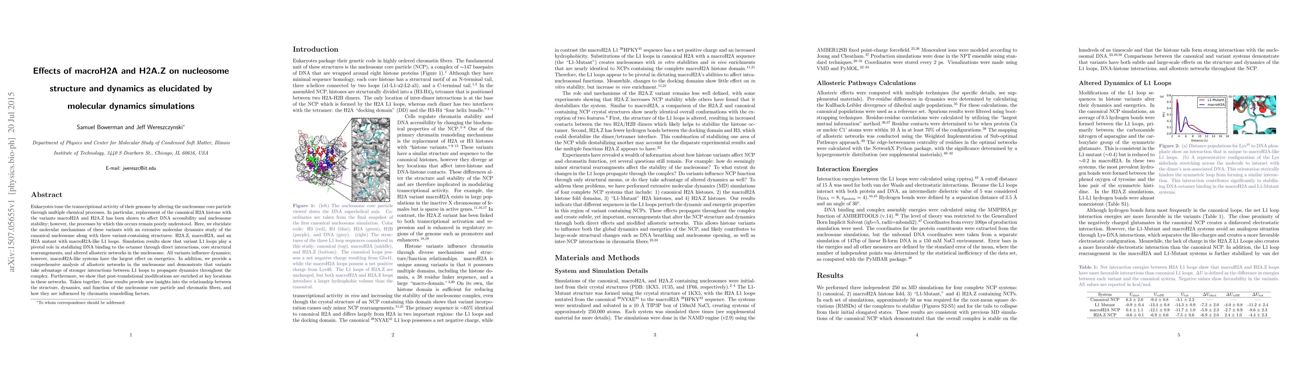 This paper uses molecular dynamics simulations to investigate how histone variants macroH2A and H2A.Z affect nucleosome structure and dynamics. The study reveals that these variants, particularly macroH2A, significantly alter nucleosome stability and dynamics through their unique L1 loops, which influence DNA binding and allosteric communication within the nucleosome.