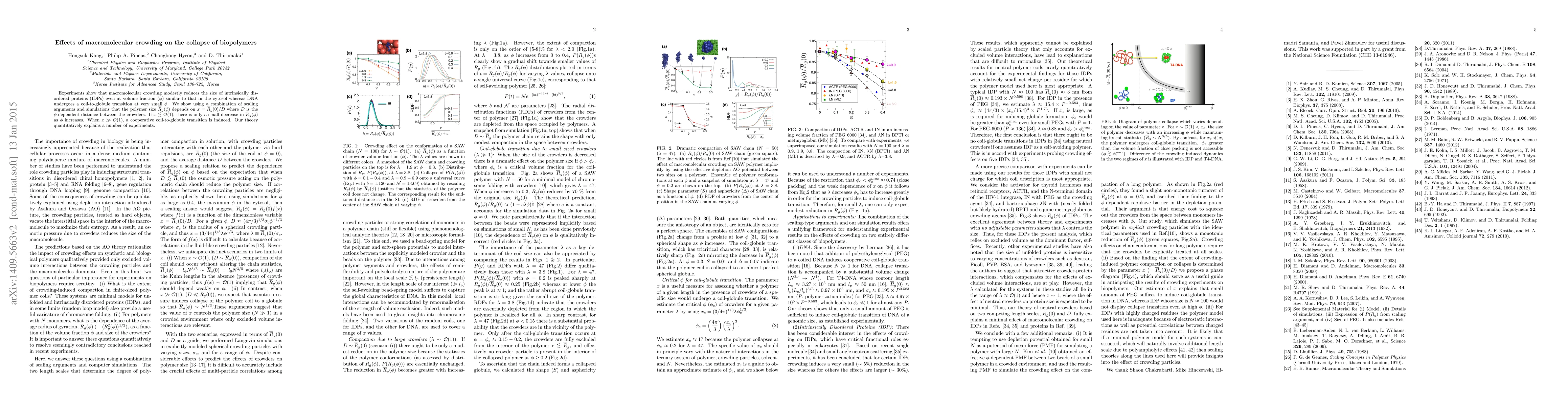 This paper investigates how macromolecular crowding affects the collapse of biopolymers, finding that it induces a coil-to-globule transition in DNA at low volume fractions but only modestly reduces the size of intrinsically disordered proteins. The study combines scaling arguments and simulations to explain the dependence of polymer size on crowder distance.