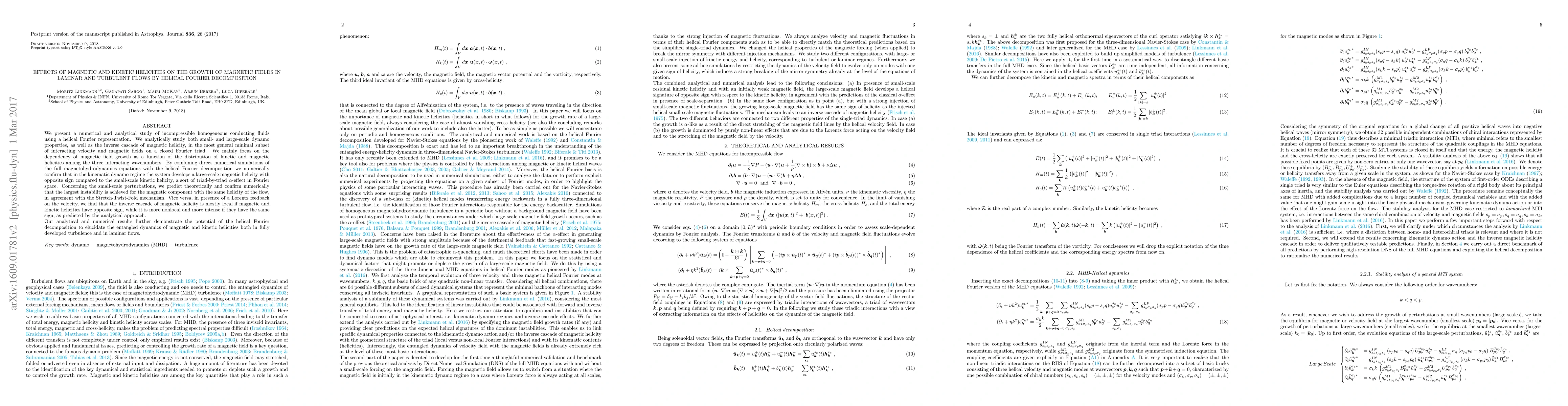 This study investigates the growth of magnetic fields in incompressible conducting fluids via helical Fourier decomposition, focusing on the interplay between kinetic and magnetic helicities. It reveals that in laminar flows, magnetic helicity develops oppositely to kinetic helicity, while in turbulent flows, the inverse cascade is more nonlocal and intense when helicities are aligned.