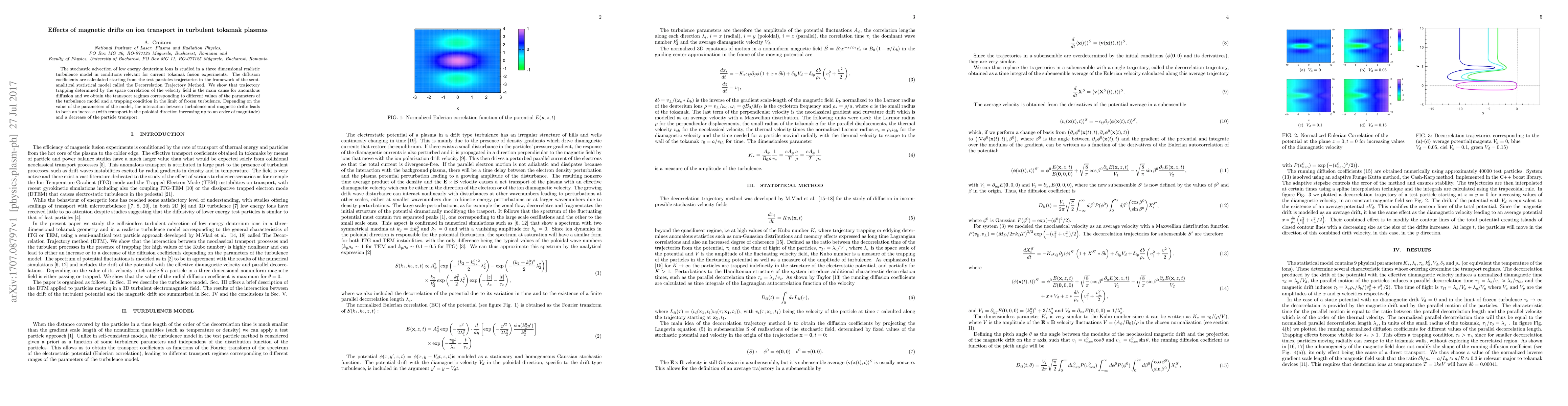 The stochastic advection of low energy deuterium ions is studied in a three dimensional realistic turbulence model in conditions relevant for current tokamak fusion experiments. The diffusion coefficients are calculated starting from the test particles trajectories in the framework of the semi-analitical statistical model called the Decorrelation Trajectory Method. We show that trajectory trapping determined by the space correlation of the velocity field is the main cause for anomalous diffusion and we obtain the transport regimes corresponding to different values of the parameters of the turbulence model and a trapping condition in the limit of frozen turbulence. Depending on the value of the parameters of the model, the interaction between turbulence and magnetic drifts leads to both an increase (with transport in the poloidal direction increasing up to an order of magnitude) and a decrease of the particle transport.