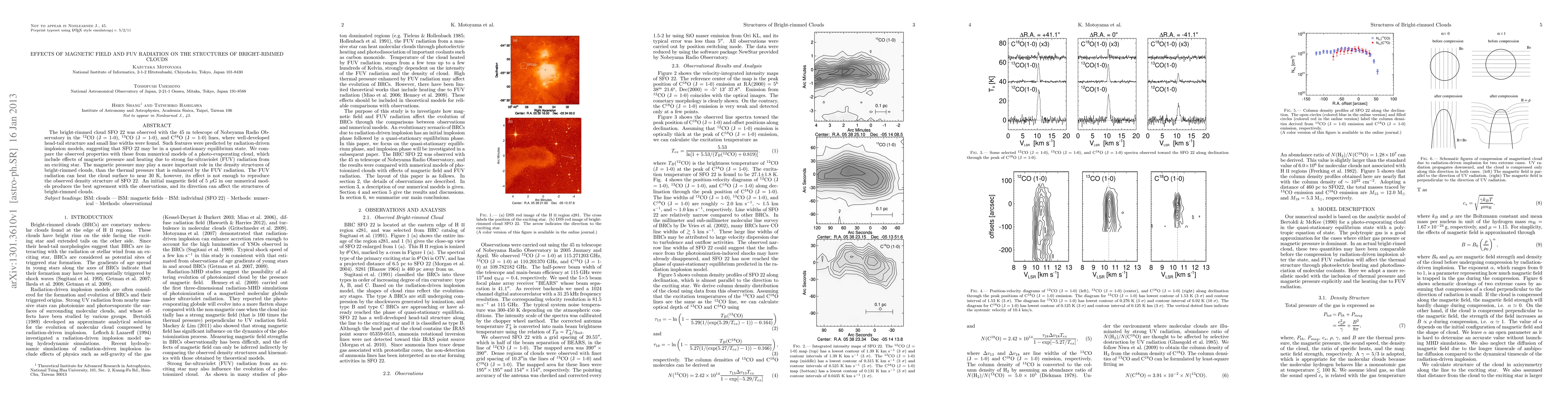 Researchers studied bright-rimmed clouds and found that magnetic field pressure plays a key role in their density structures, while FUV radiation only heats the cloud surface.