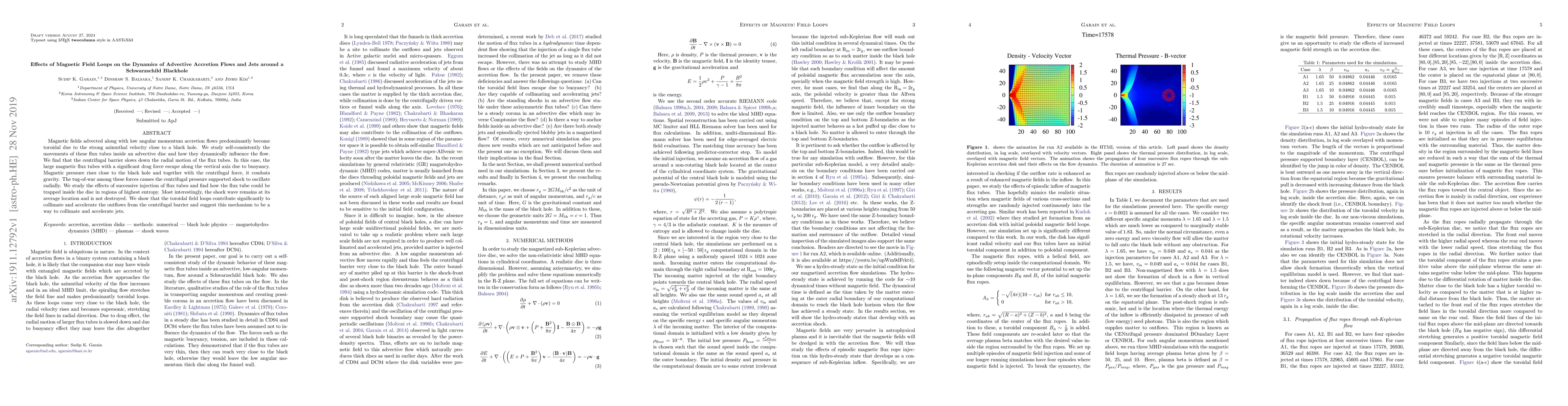 Magnetic fields advected along with low angular momentum accretion flows predominantly become toroidal due to the strong azimuthal velocity close to a black hole. We study self-consistently the movements of these flux tubes inside an advective disc and how they dynamically influence the flow. We find that the centrifugal barrier slows down the radial motion of the flux tubes. In this case, the large magnetic flux tubes with a significant drag force escape along the vertical axis due to buoyancy. Magnetic pressure rises close to the black hole and together with the centrifugal force, it combats gravity. The tug-of-war among these forces causes the centrifugal pressure supported shock to oscillate radially. We study the effects of successive injection of flux tubes and find how the flux tube could be trapped inside the disc in regions of highest entropy. Most interestingly, the shock wave remains at its average location and is not destroyed. We show that the toroidal field loops contribute significantly to collimate and accelerate the outflows from the centrifugal barrier and suggest this mechanism to be a way to collimate and accelerate jets.