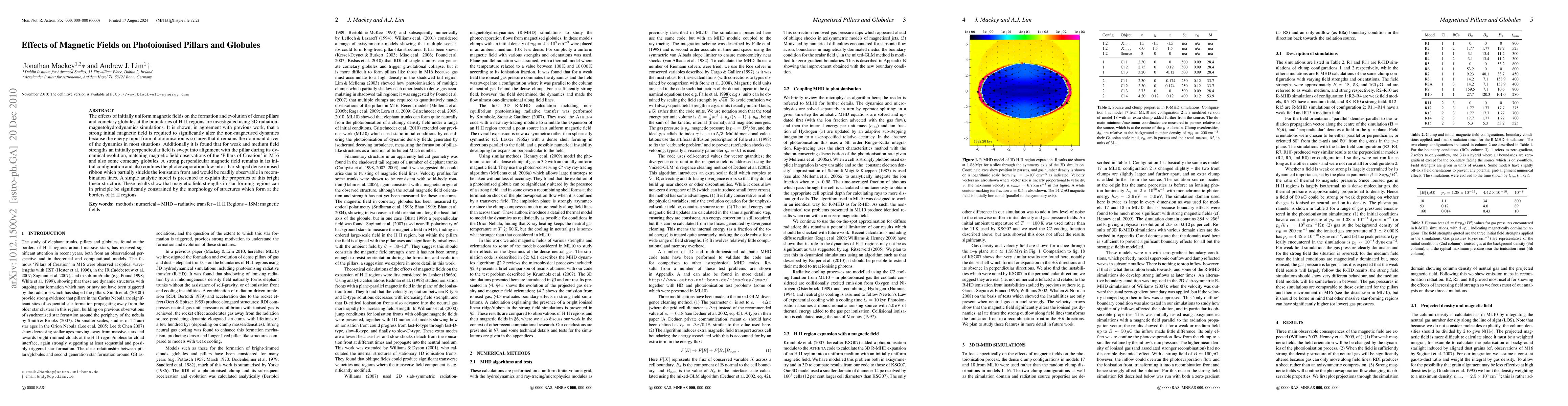 Research shows that strong magnetic fields can significantly alter the formation of dense pillars and cometary globules in star-forming regions, while weaker fields align with the pillar and create distinct structures observable in recombination lines.