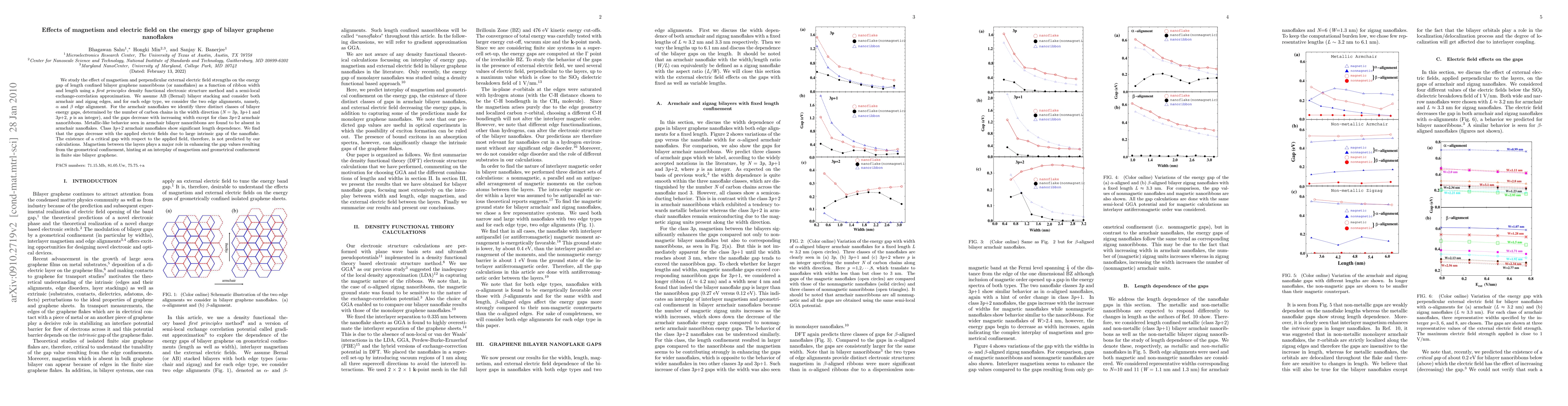 We study the effect of magnetism and perpendicular external electric field strengths on the energy gap of length confined bilayer graphene nanoribbons (or nanoflakes) as a function of ribbon width and length using a \textit{first principles} density functional electronic structure method and a semi-local exchange-correlation approximation. We assume AB (Bernal) bilayer stacking and consider both armchair and zigzag edges, and for each edge type, we consider the two edge alignments, namely, $\alpha$ and $\beta$ edge alignment. For the armchair nanoflakes we identify three distinct classes of bilayer energy gaps, determined by the number of carbon chains in the width direction ({\it N} = 3{\it p}, 3{\it p}+1 and 3{\it p}+2, {\it p} is an integer), and the gaps decrease with increasing width except for class 3{\it p}+2 armchair nanoribbons. Metallic-like behavior seen in armchair bilayer nanoribbons are found to be absent in armchair nanoflakes. Class 3{\it p}+2 armchair nanoflakes show significant length dependence. We find that the gaps decrease with the applied electric fields due to large intrinsic gap of the nanoflake. The existence of a critical gap with respect to the applied field, therefore, is not predicted by our calculations. Magnetism between the layers plays a major role in enhancing the gap values resulting from the geometrical confinement, hinting at an interplay of magnetism and geometrical confinement in finite size bilayer graphene.
