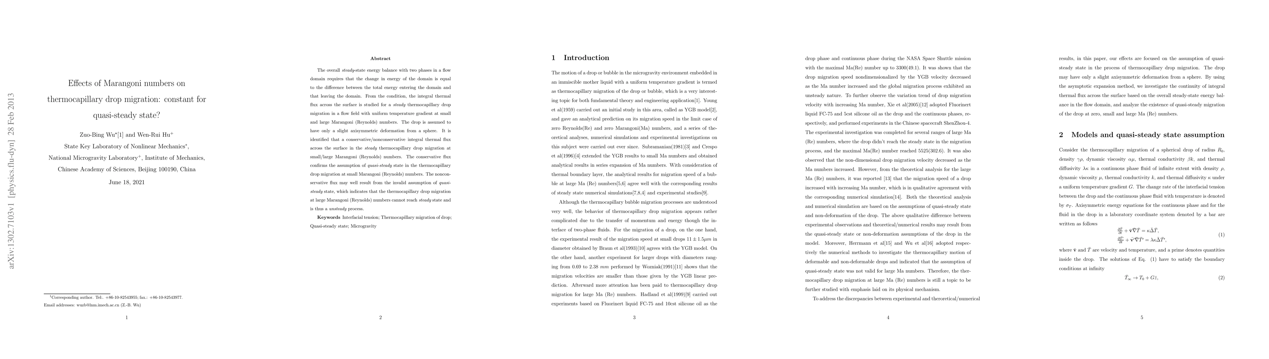 This study investigates the integral thermal flux across the surface of thermocapillary drop migration under varying Marangoni numbers, confirming a quasi-steady state at small Marangoni numbers with conservative flux, while large Marangoni numbers result in nonconservative flux, indicating an unsteady state.