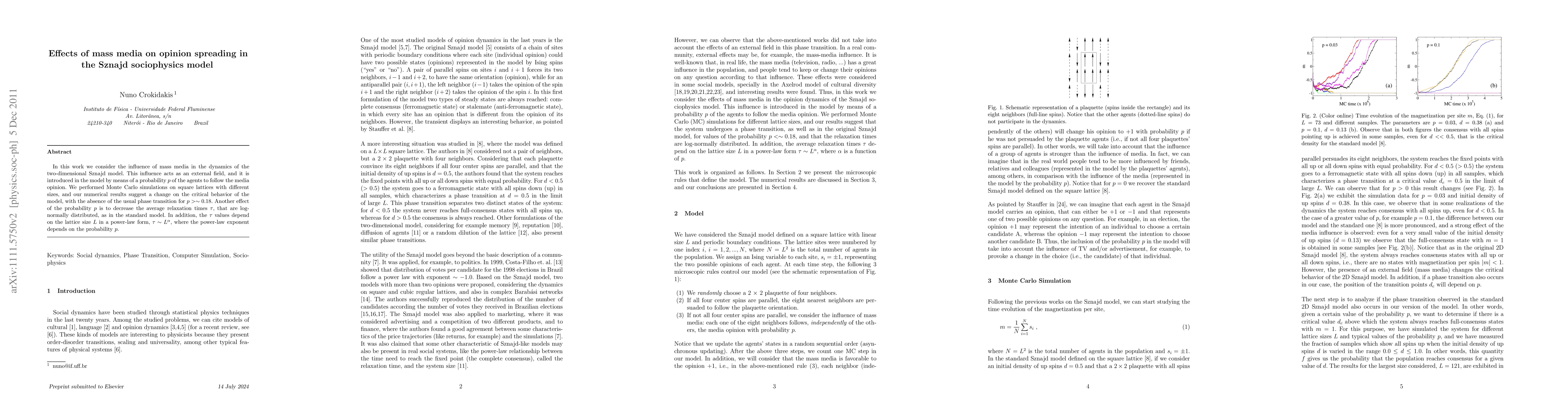 The Sznajd model dynamics change when considering mass media influence, altering critical behavior with high probability p values and decreasing average relaxation times in a lattice-size dependent manner.