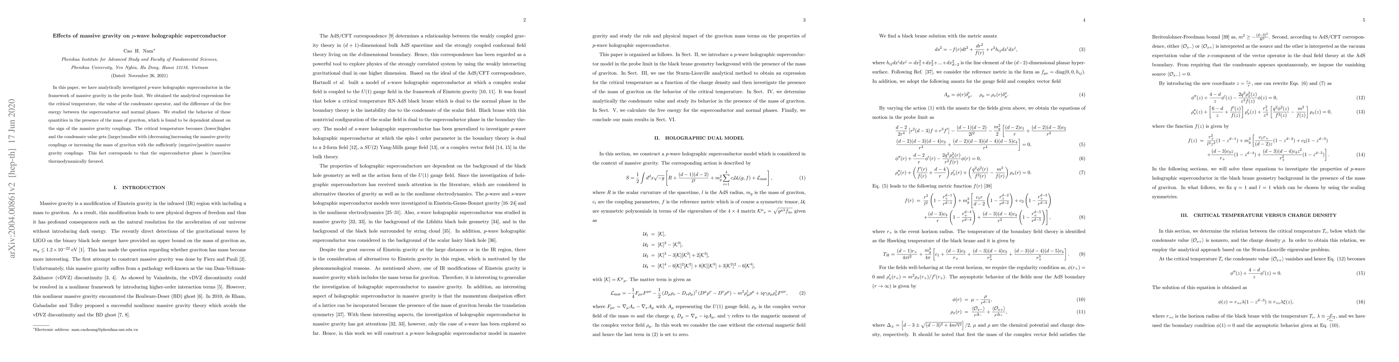 In this paper, we have analytically investigated $p$-wave holographic superconductor in the framework of massive gravity in the probe limit. We obtained the analytical expressions for the critical temperature, the value of the condensate operator, and the difference of the free energy between the superconductor and normal phases. We studied the behavior of these quantities in the presence of the mass of graviton, which is found to be dependent almost on the sign of the massive gravity couplings. The critical temperature becomes (lower)higher and the condensate value gets (larger)smaller with (decreasing)increasing the massive gravity couplings or increasing the mass of graviton with the sufficiently (negative)positive massive gravity couplings. This fact corresponds to that the superconductor phase is (more)less thermodynamically favored.