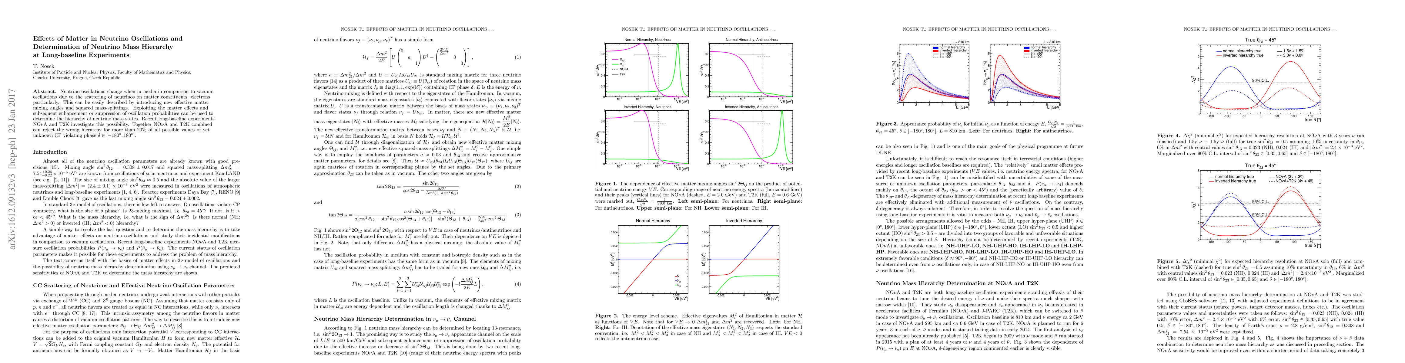 This paper explores how neutrino oscillations are affected by matter, particularly electrons, leading to modified effective mixing angles and mass-splittings. The study uses long-baseline experiments NO$\nu$A and T2K to determine the neutrino mass hierarchy, achieving a significant probability of rejecting incorrect hierarchies.