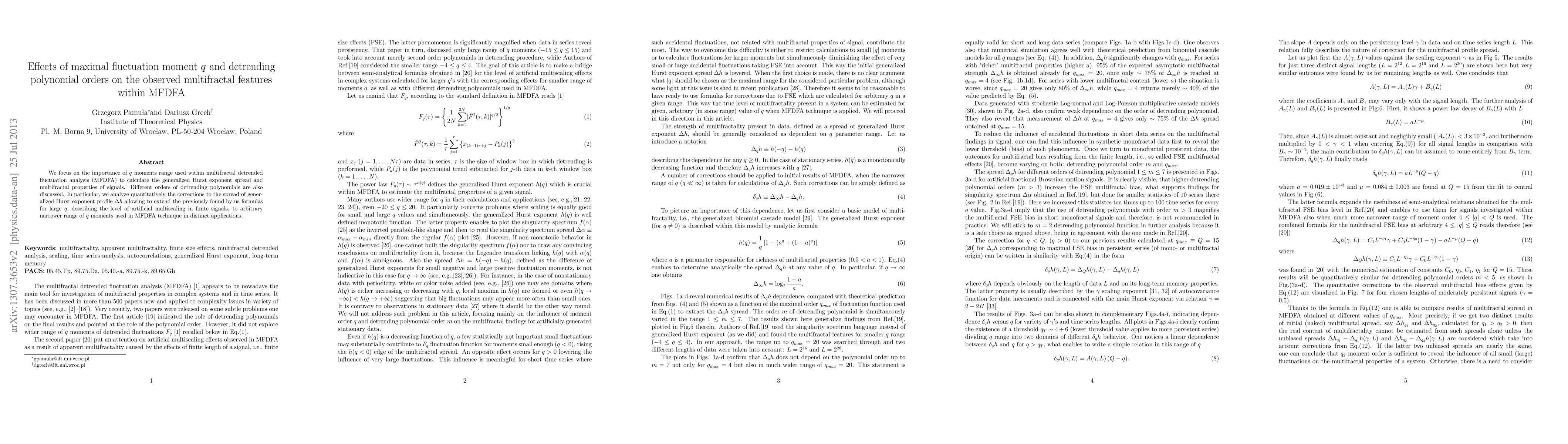 This paper investigates how varying $q$ moments and detrending polynomial orders in multifractal detrended fluctuation analysis (MFDFA) affect the calculated generalized Hurst exponent spread and multifractal properties. It also quantitatively analyzes corrections to the spread of the generalized Hurst exponent, extending previous formulas to a broader range of $q$ moments.