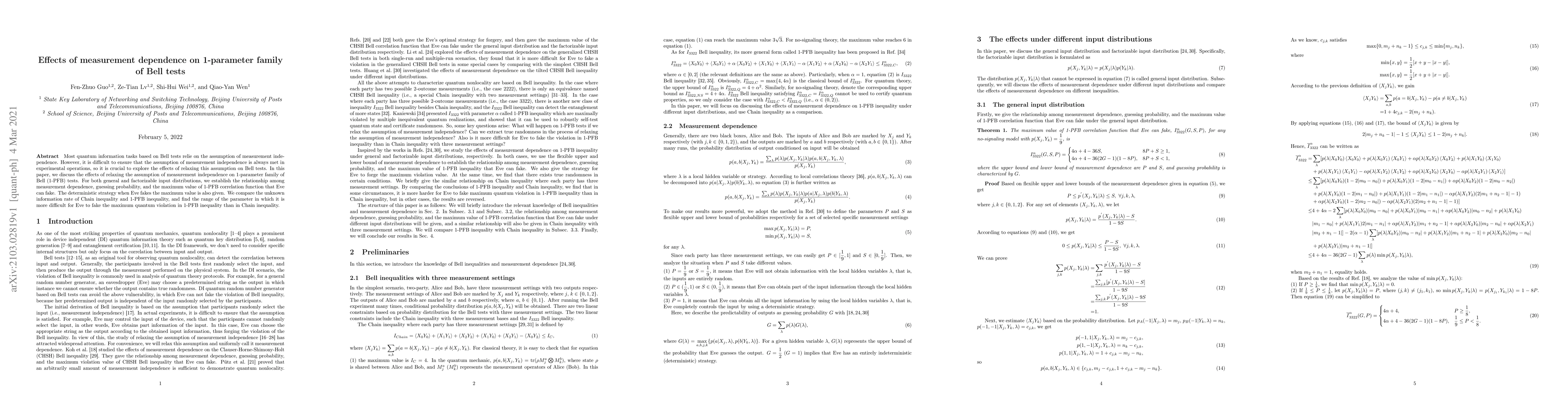 This paper investigates the impact of measurement dependence on 1-parameter family of Bell (1-PFB) tests, establishing relationships between measurement dependence, guessing probability, and the maximum correlation Eve can simulate. It finds that for certain parameters, 1-PFB tests are more resilient to Eve's manipulation compared to Chain inequality.