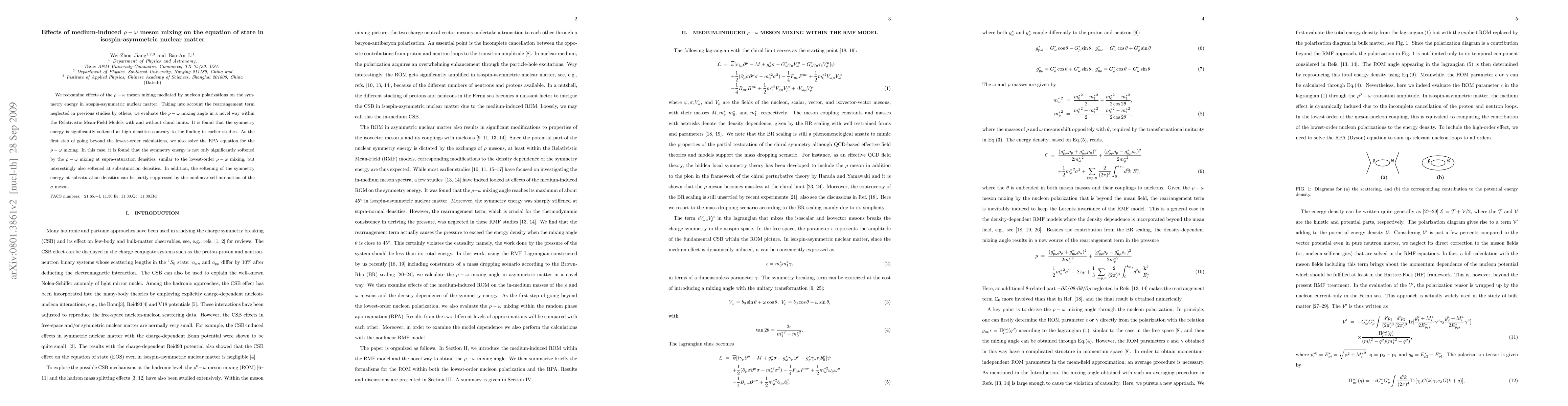 We reexamine effects of the $\rho-\omega$ meson mixing mediated by nucleon polarizations on the symmetry energy in isospin-asymmetric nuclear matter. Taking into account the rearrangement term neglected in previous studies by others, we evaluate the $\rho-\omega$ mixing angle in a novel way within the Relativistic Mean-Field Models with and without chiral limits. It is found that the symmetry energy is significantly softened at high densities contrary to the finding in earlier studies. As the first step of going beyond the lowest-order calculations, we also solve the RPA equation for the $\rho-\omega$ mixing. In this case, it is found that the symmetry energy is not only significantly softened by the $\rho-\omega$ mixing at supra-saturation densities, similar to the lowest-order $\rho-\omega$ mixing, but interestingly also softened at subsaturation densities. In addition, the softening of the symmetry energy at subsaturation densities can be partly suppressed by the nonlinear self-interaction of the $\sigma$ meson.