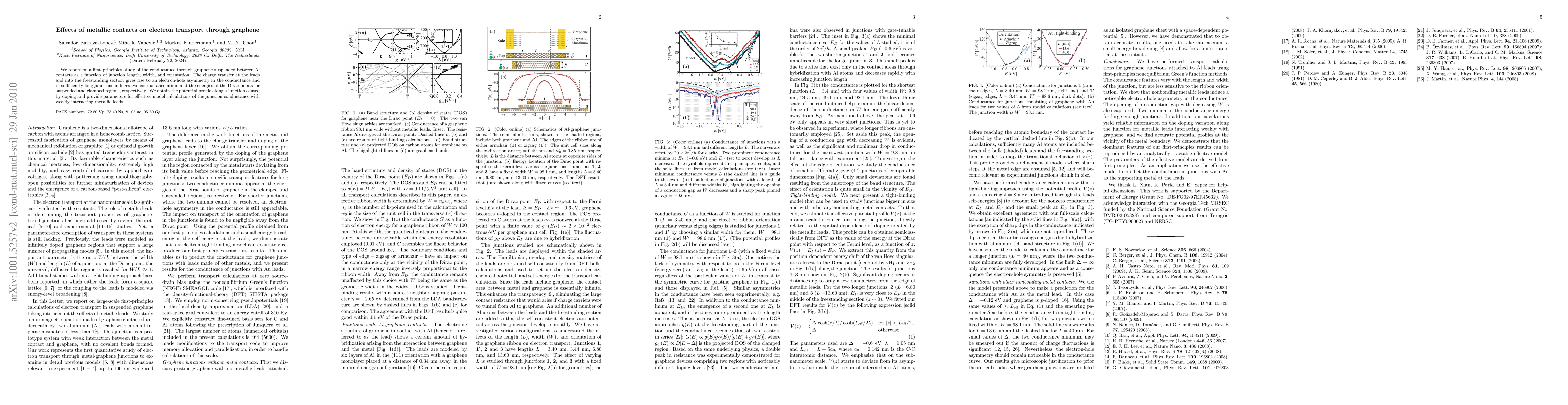 This study investigates the conductance of graphene between aluminum contacts, revealing electron-hole asymmetry in electron transport and identifying two conductance minima at Dirac points in long junctions. The research provides a potential profile and parameters for effective model calculations of junction conductance with metallic leads.