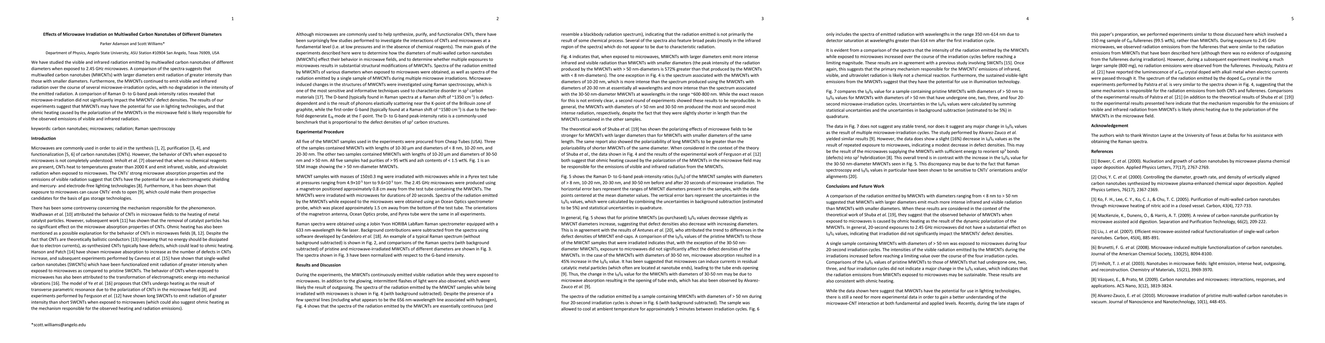 This study reveals that larger diameter multiwalled carbon nanotubes emit more intense visible and infrared radiation under 2.45 GHz microwaves without significant degradation or defect changes, suggesting potential applications in lighting technologies.